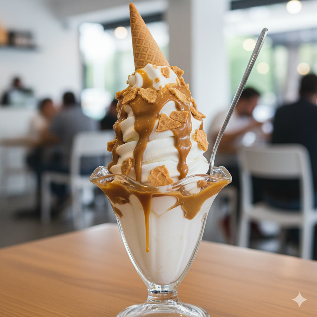 Delicioso helado de barquillo acompañado de trozos de barquillo y salsa de arequipe.