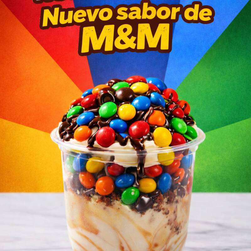 Delicioso helado a base de yogurt, acompañado de M&M, salsa de chocolate.