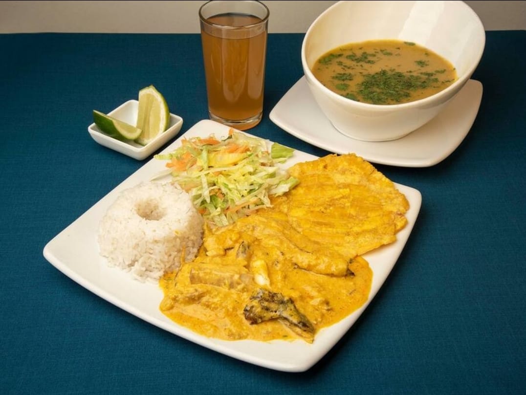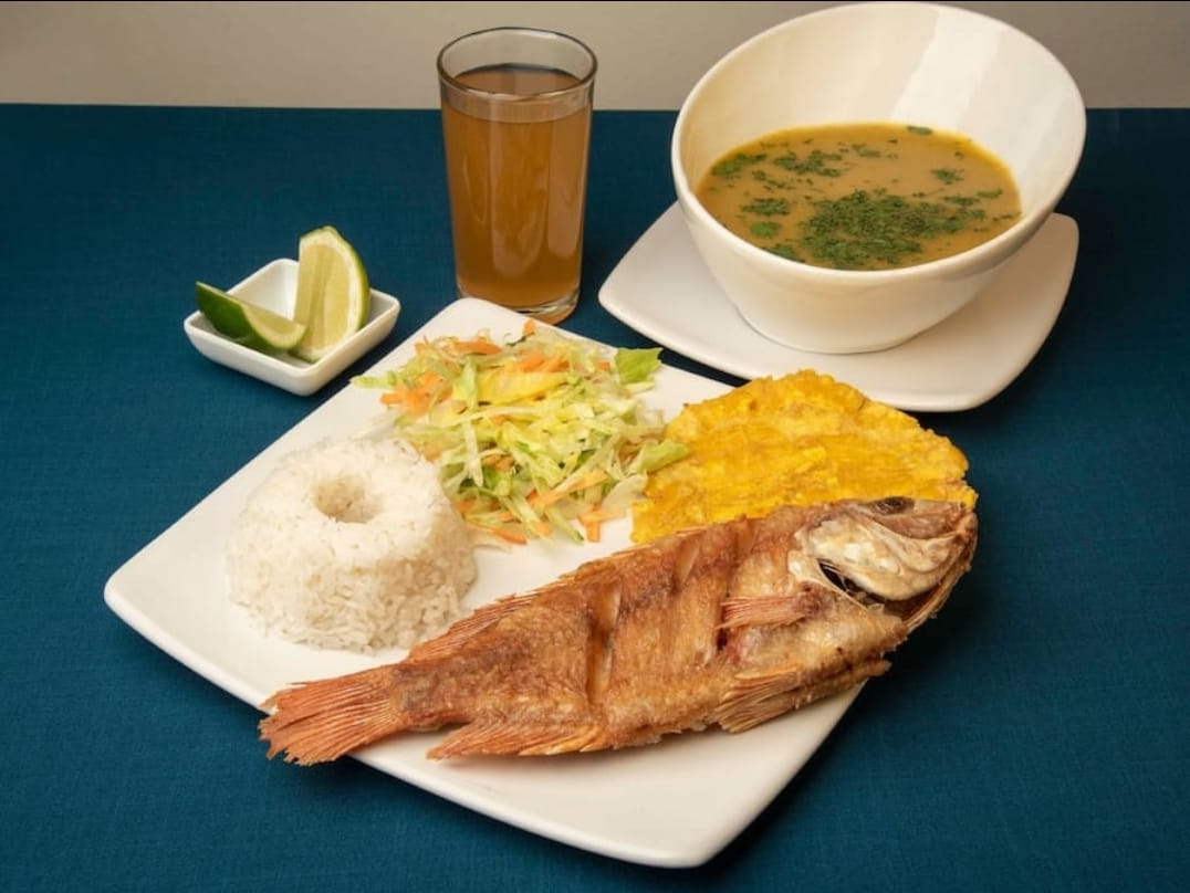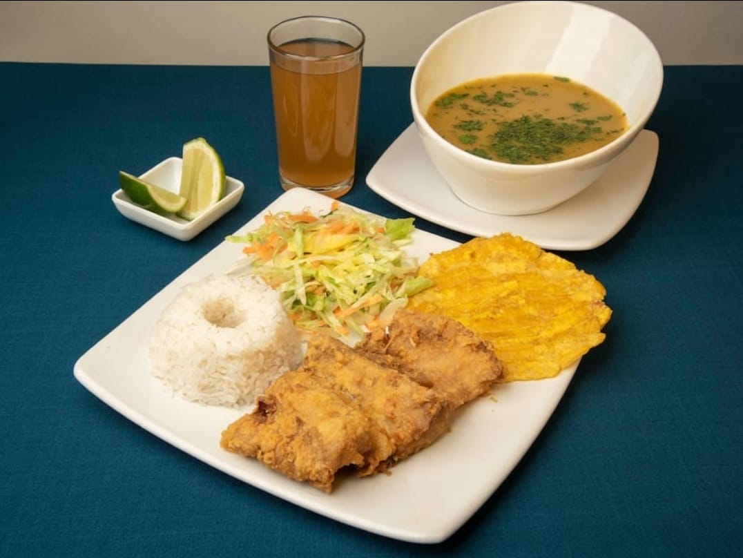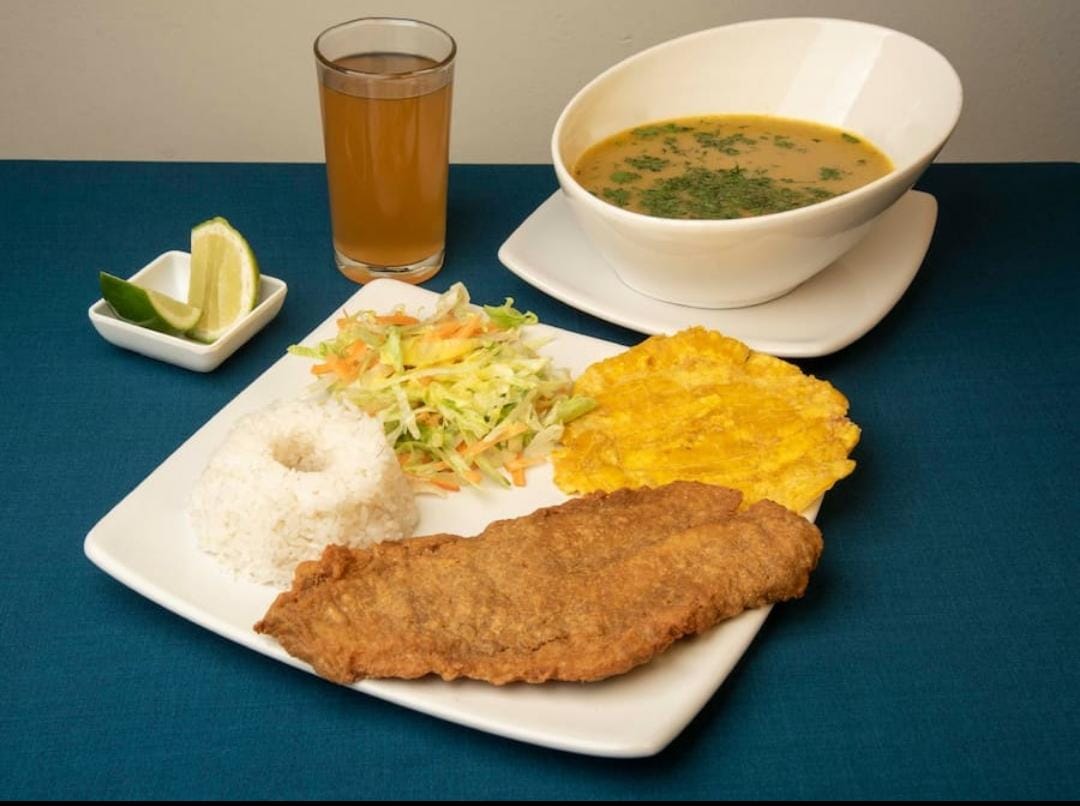 Sancocho acompañado de tilapia aproximadamente 150 gr, arroz, ensalada, tostada y limonada