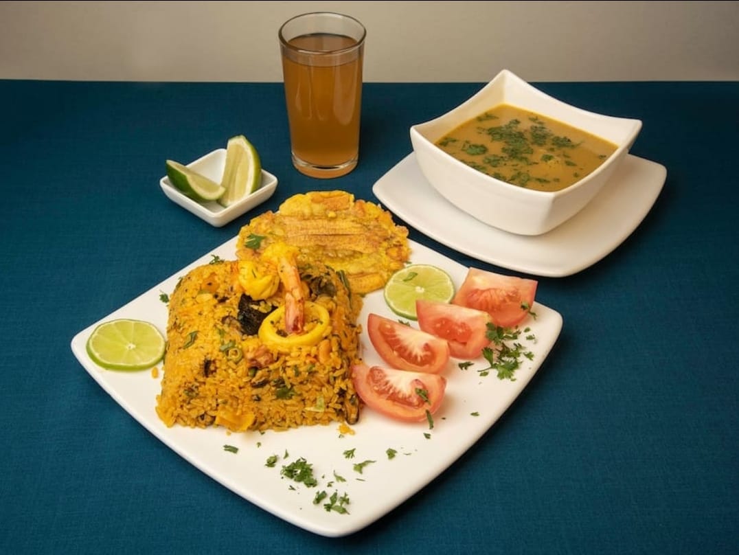Cazuela de Camarones o mariscos con arroz blanco, ensalada de lechuga y tomate, tostada de plátano y limonada.