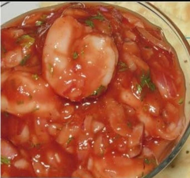 Ceviche de camarones con cebolla, cilantro y salsa de tomate.