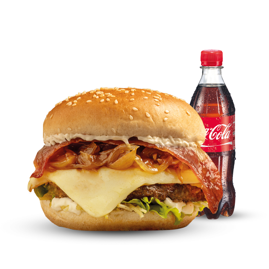 Everyone's Favorite Con Carne exclusiva Herreros 150 Gr. Pan Artesanal Brioche, Tocineta Ahumada, Queso Mozzarella , Cebolla Caramelizada, Lechuga, Tomate en Rodajas, Salsa BBQ, Salsas Exclusiva Herreros + Gaseosa Coca Cola 250ml