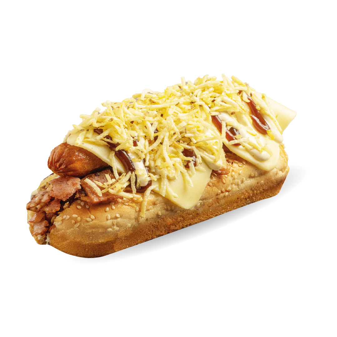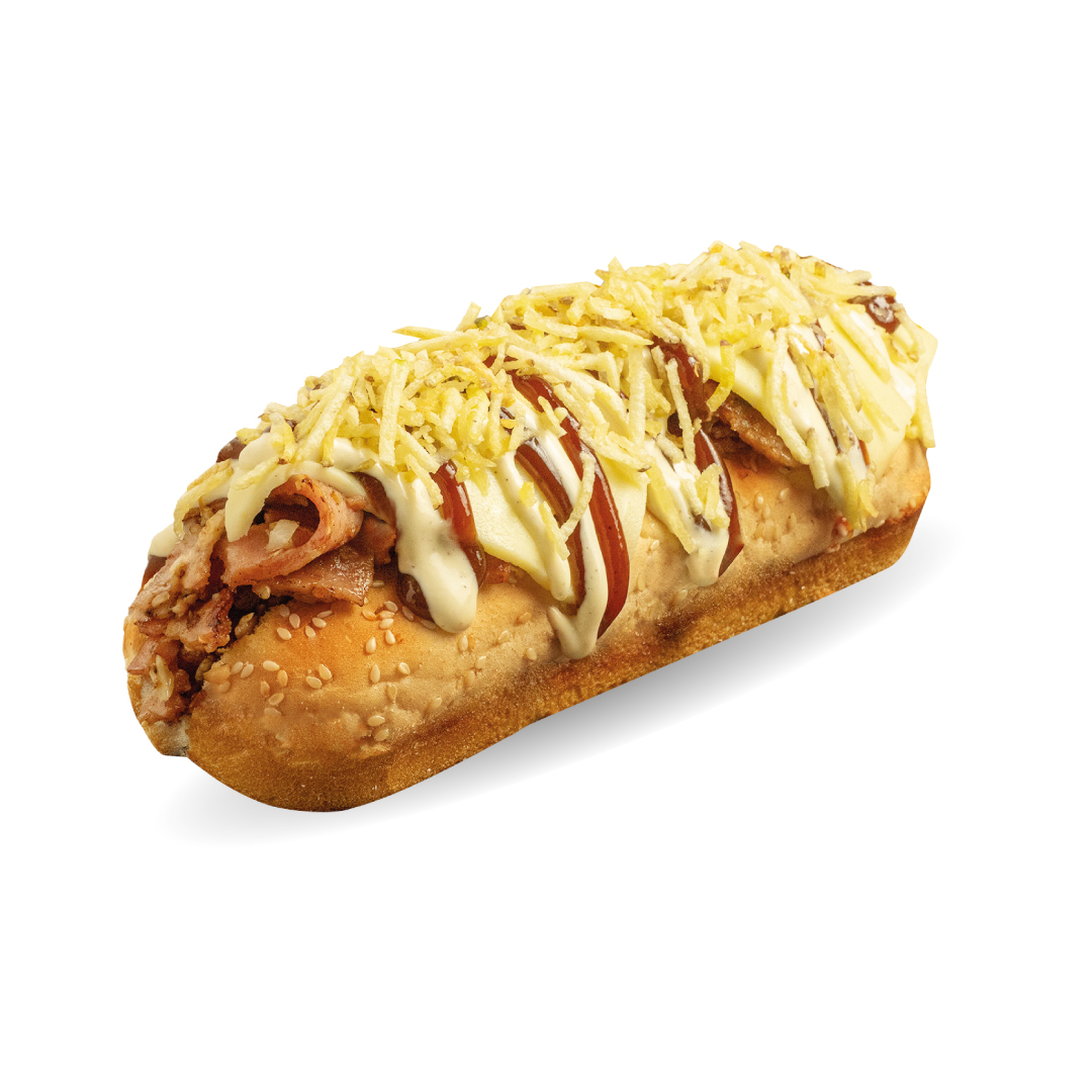 Con Tocineta de Cerdo Ahumada Salteada con Cebolla y Salsa BBQ, Salchicha Americana Pan Artesanal Brioche, Queso Mozzarella, Lechuga y Cebolla Picada, Ripio de papa, Salsas Exclusiva Herreros.