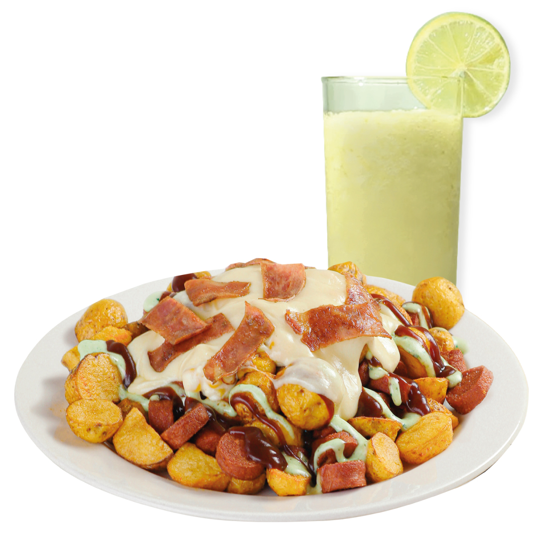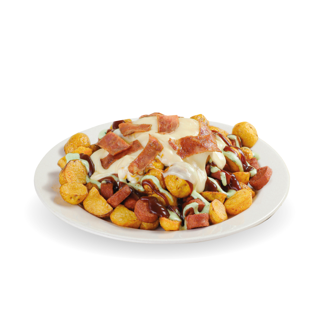 Papa 140 g, bañadas en queso mozzarella y tocineta. Exclusiva de Herreros.