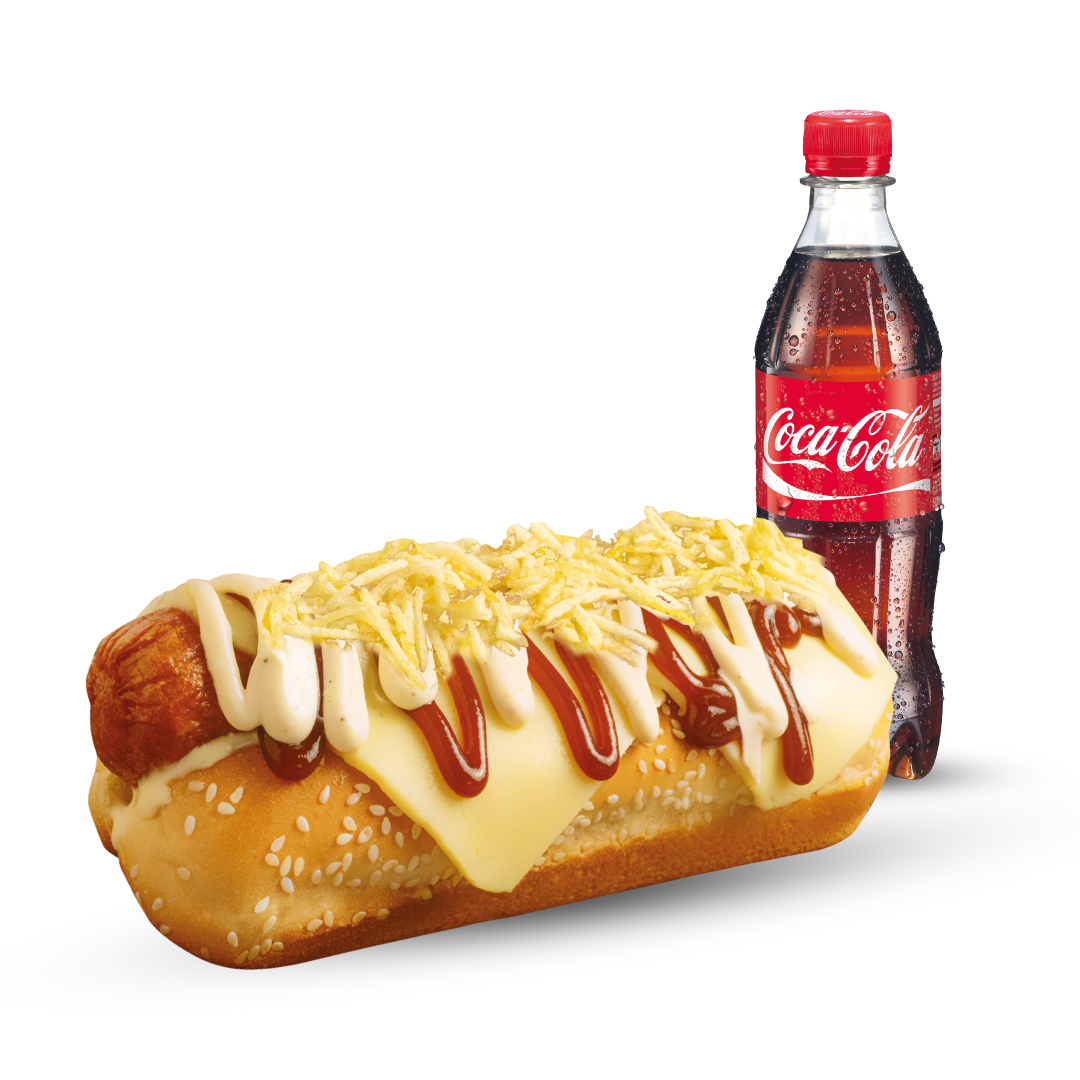 Perro Caliente con Salchicha Americana de 115Gr, Queso Mozzarella, Salsa BBQ, Salsas Exclusivas Herreros, Ripio de Papa + Gaseosa Coca Cola 250ml