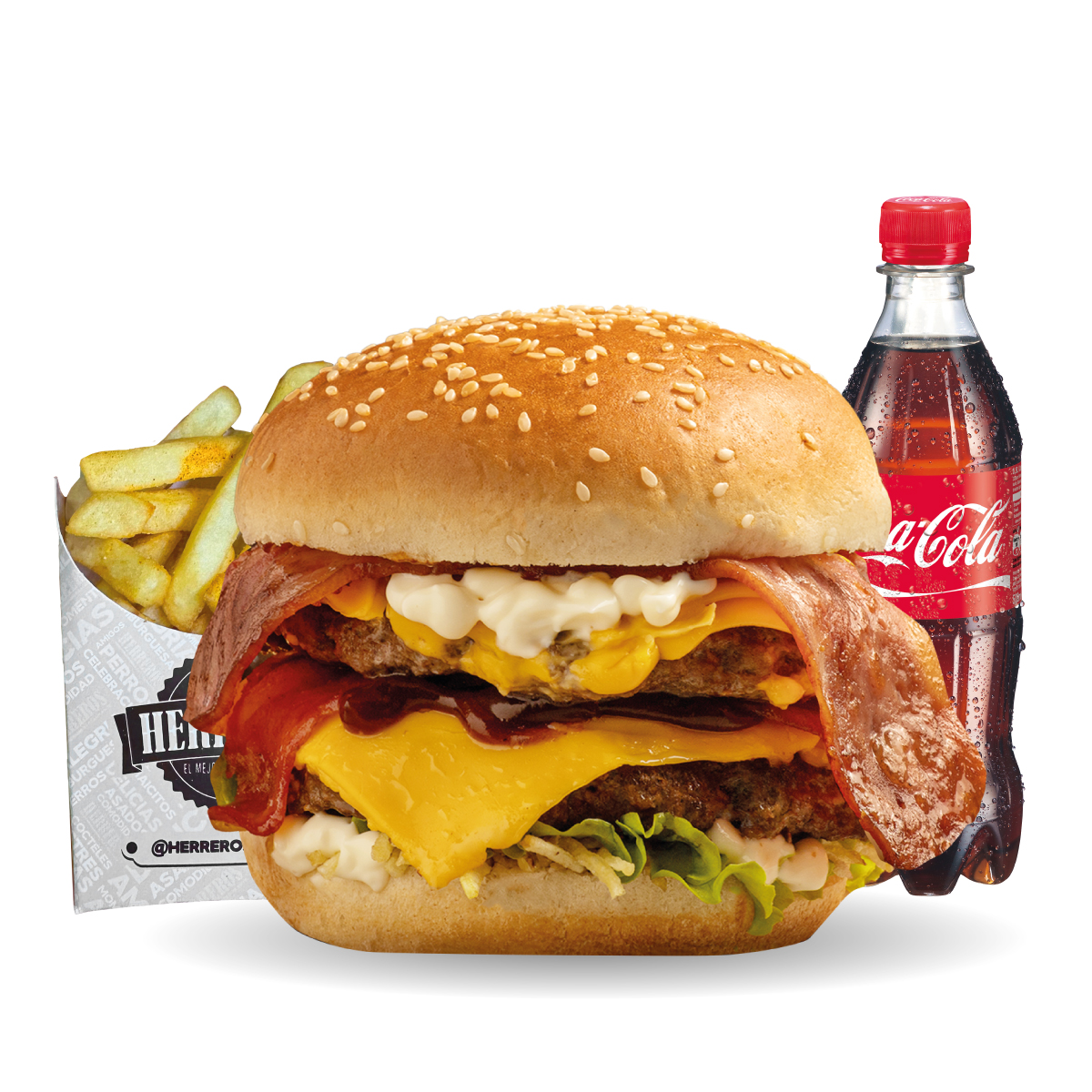 Doble carne 150 g, exclusiva Herreros, doble queso cheddar, doble tocineta, BBQ, salsa de mamá, lechuga y cebolla + Papas + Gaseosa