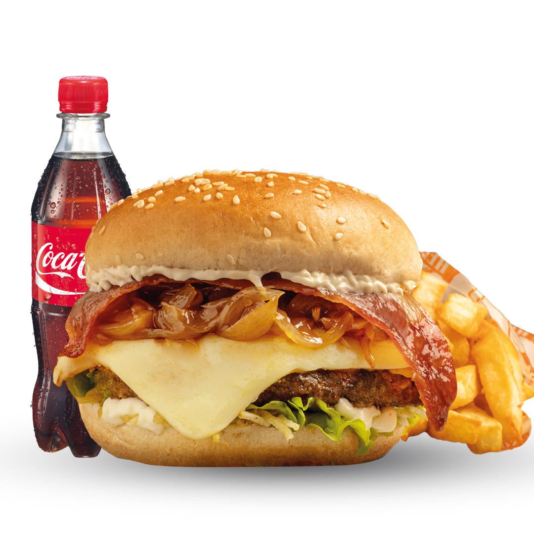 Carne 150 g, exclusiva Herreros, queso mozzarella, cebolla caramelizada, tocineta, salsa de mamá, BBQ, lechuga y cebolla + Papas 100Gramos + Coca Cola Original 250ml