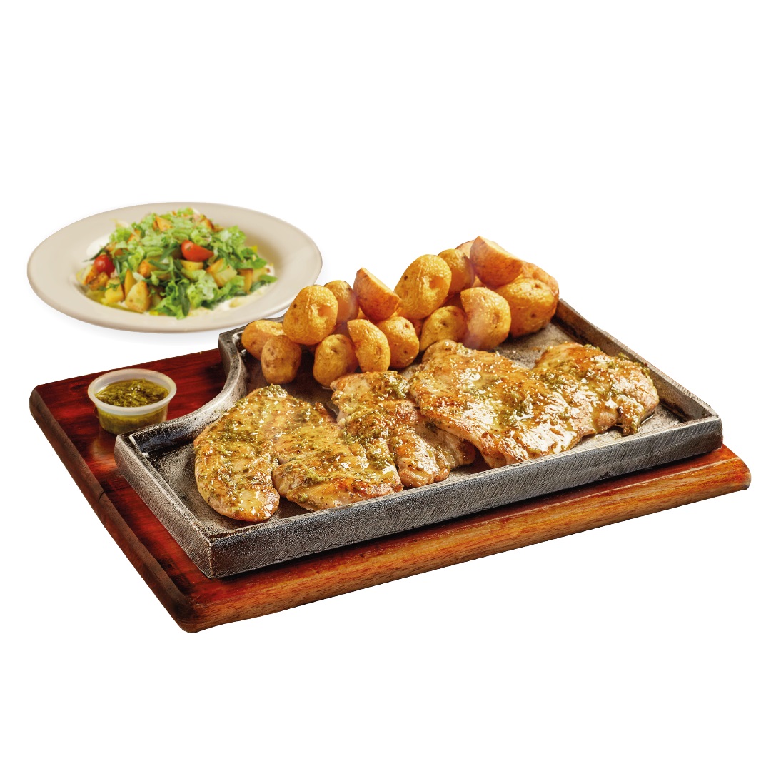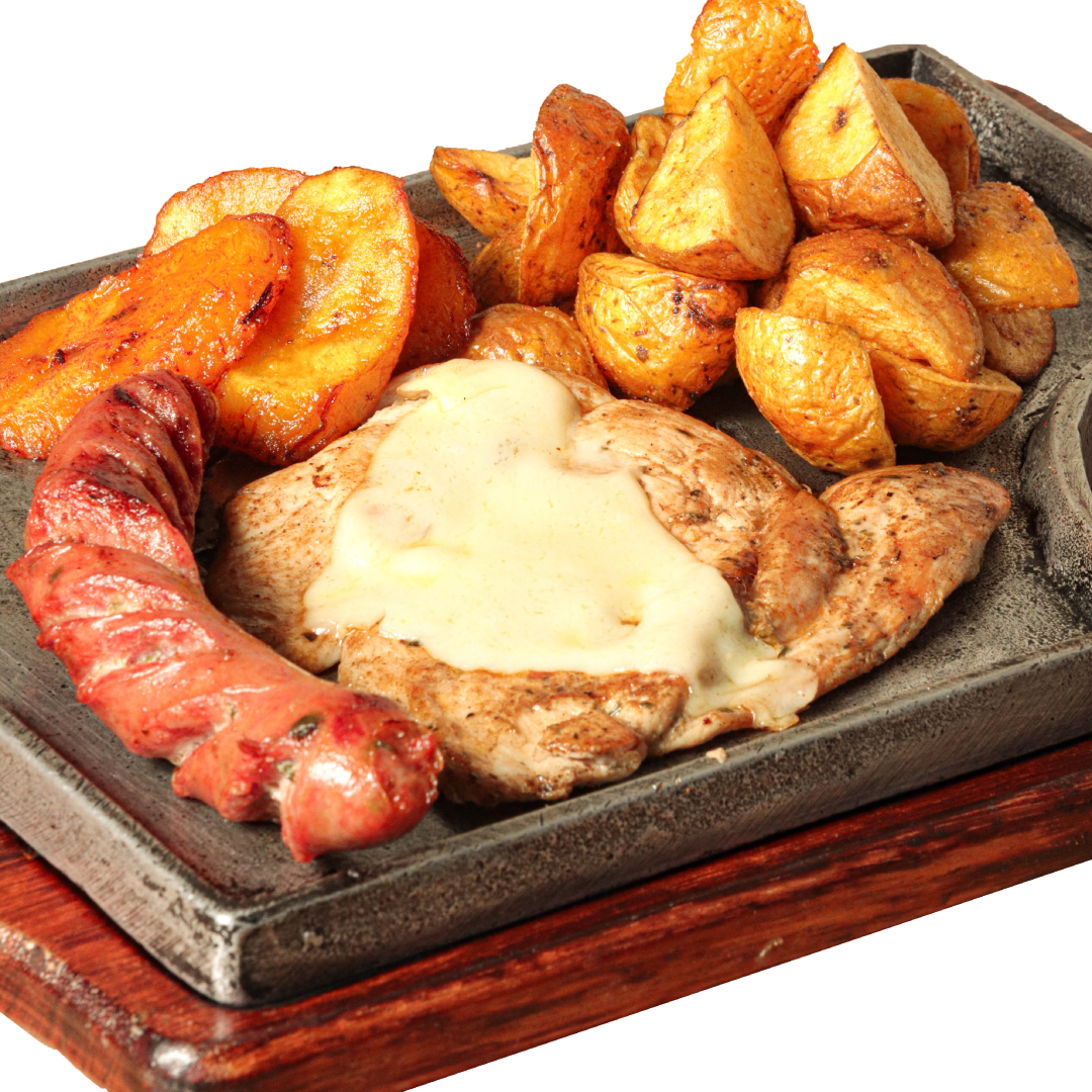 120Gr de Pollo, acompañados de Chorizo exclusivo Herreros, Papas Criollas Medianas y Salsa Herreros