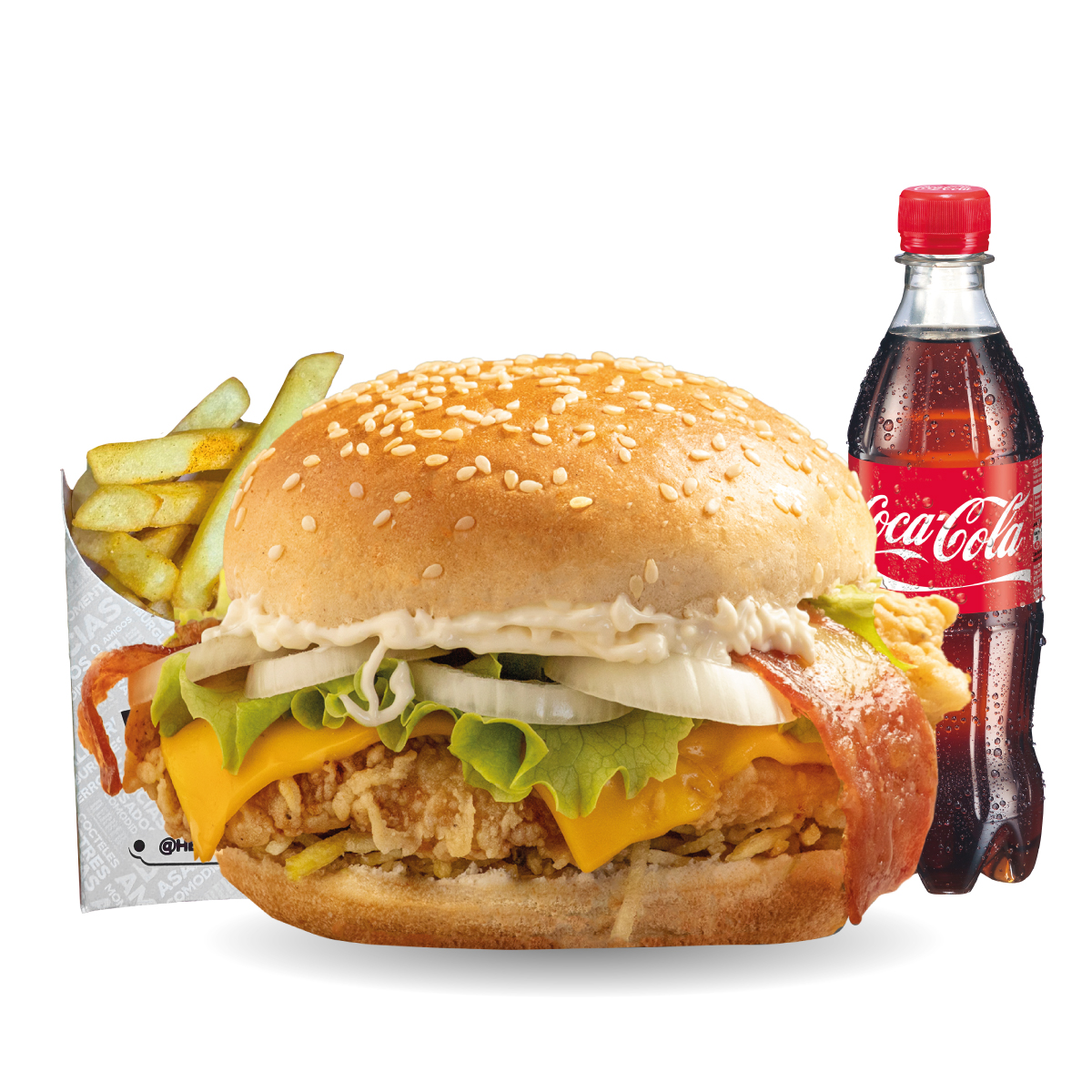 Pollo crispy 140 g, queso americano, tocineta, salsa de mamá, BBQ, lechuga y cebolla + Papas + Gaseosa