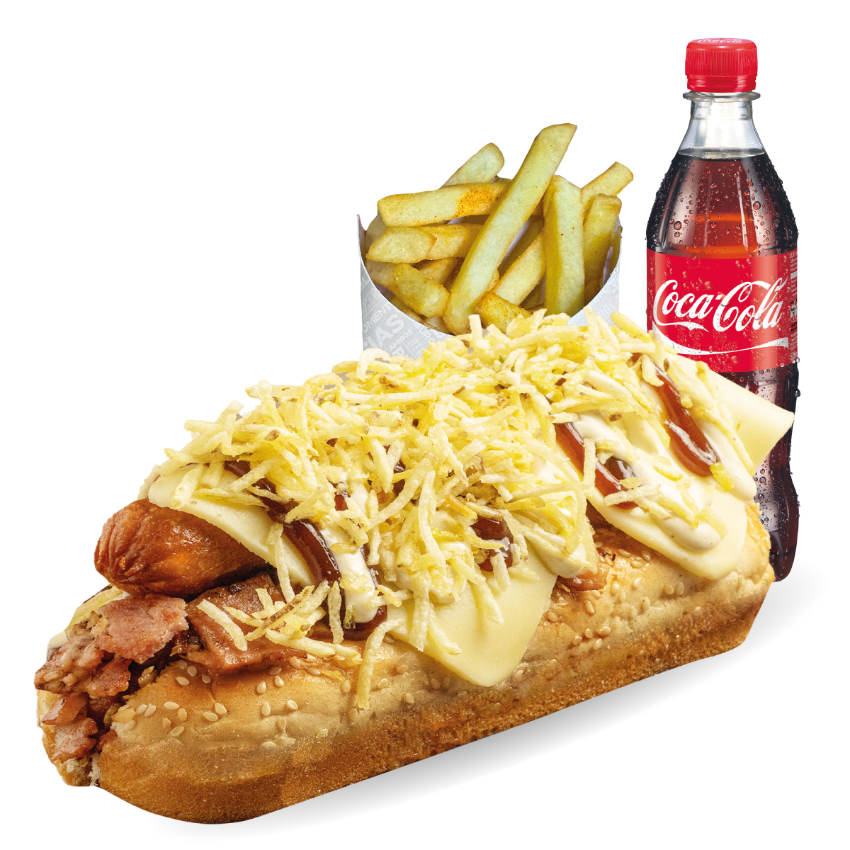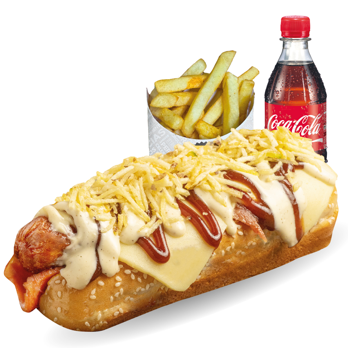 Salchicha americana, queso mozzarella, salsa exclusiva de mamá, BBQ, vegetales frescos y ripio de papa + Papas + Gaseosa