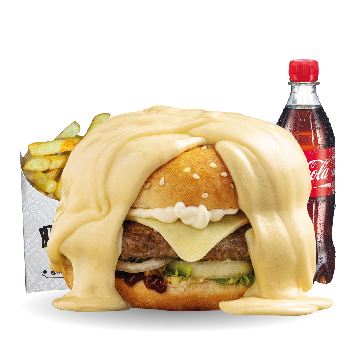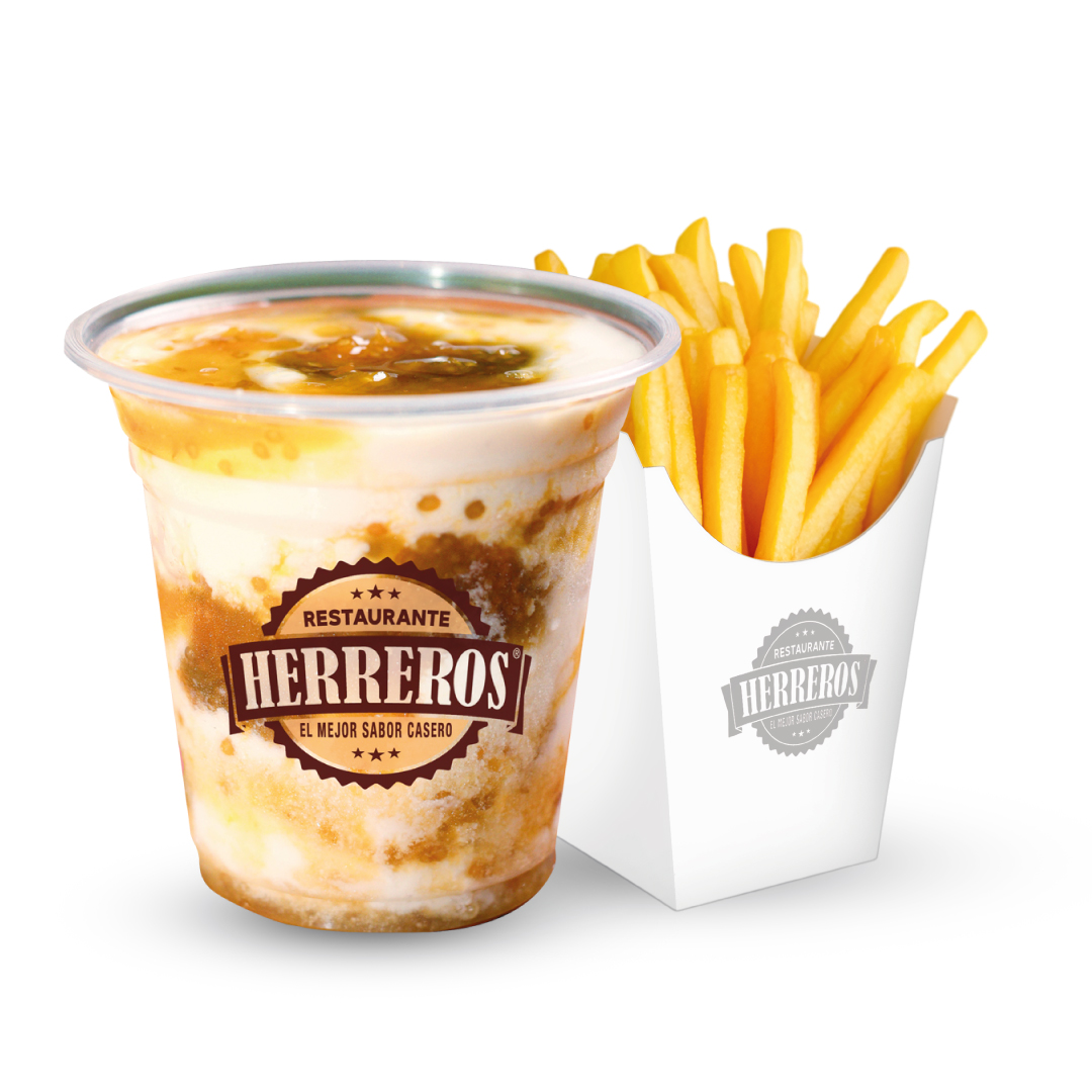 Carne 150 g, exclusivo Herreros, queso mozzarella, salsa de mama, BBQ, lechuga y cebolla + Papas + Gaseosa