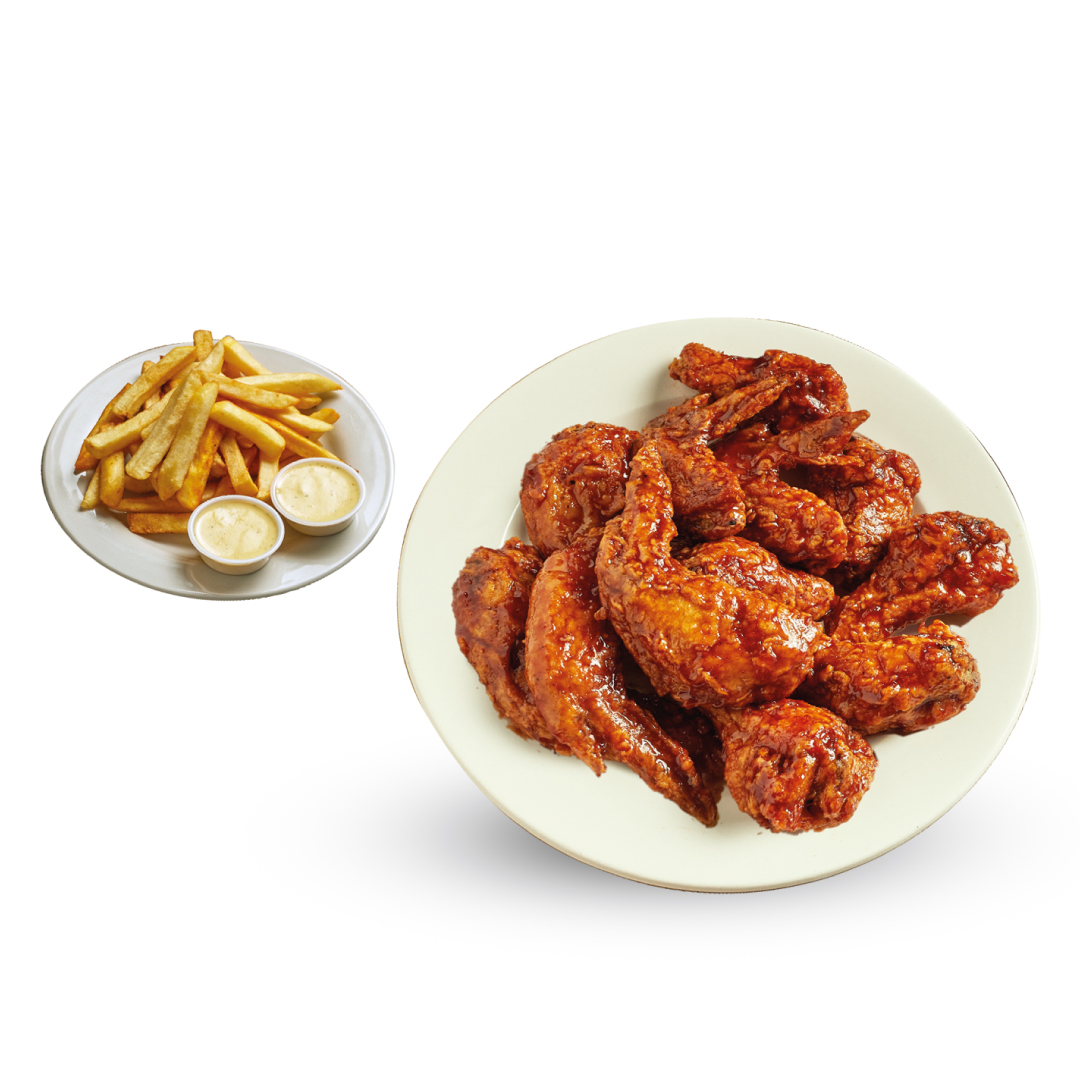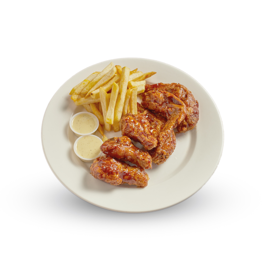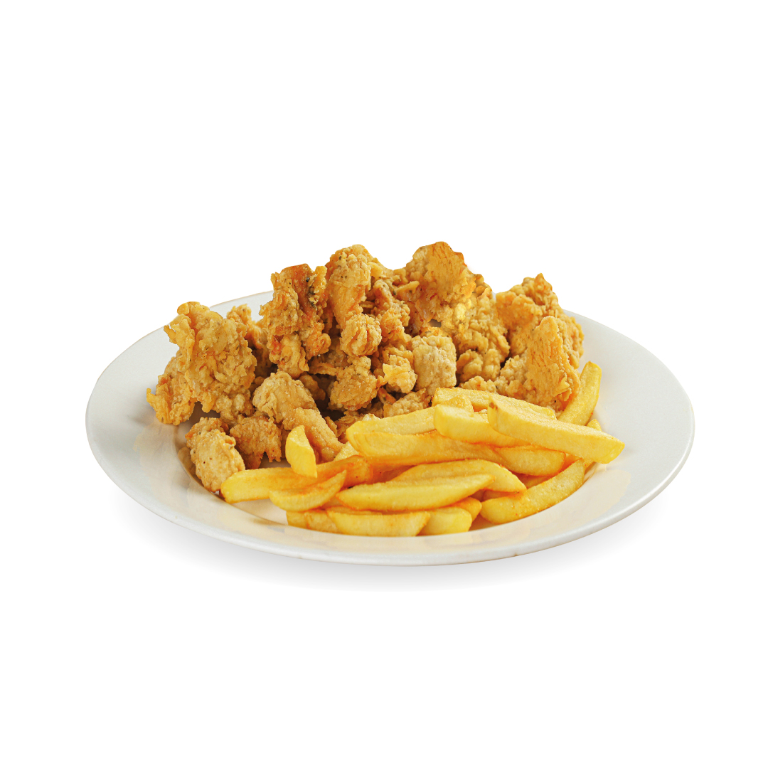 Tiras de Pechuga de Pollo apanadas a mano, Acompañadas con papa a la francesa y salsa BBQ