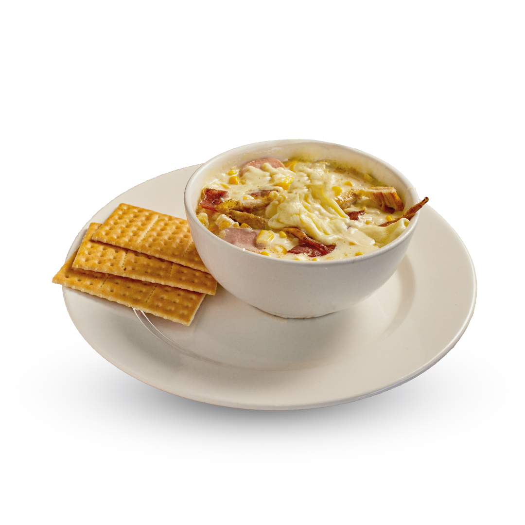 Maicitos Calientes con Carne de Cerdo, Salchicha Ranchera y Tocineta Ahumada, Mezclado en Cream cheese, con Extra-Queso acompañado con Galletas club.