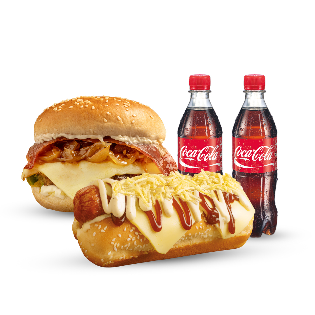 1 Hamburguesa Guerrero de mi Barrio Carne 150 g, exclusiva Herreros, queso mozzarella, cebolla caramelizada, tocineta, salsa de mamá, BBQ, lechuga y cebolla + Perro Caliente + 2 Coca Cola Original 250ml