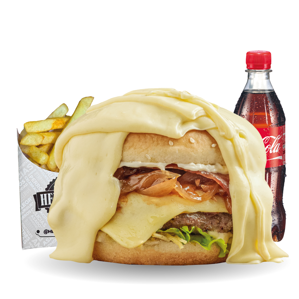 Carne 150 g, exclusivos Herreros, tocineta, queso cheddar, queso mozzarella, queso crema, salsa de mama, BBQ, lechuga y cebolla + Papas + Gaseosa
