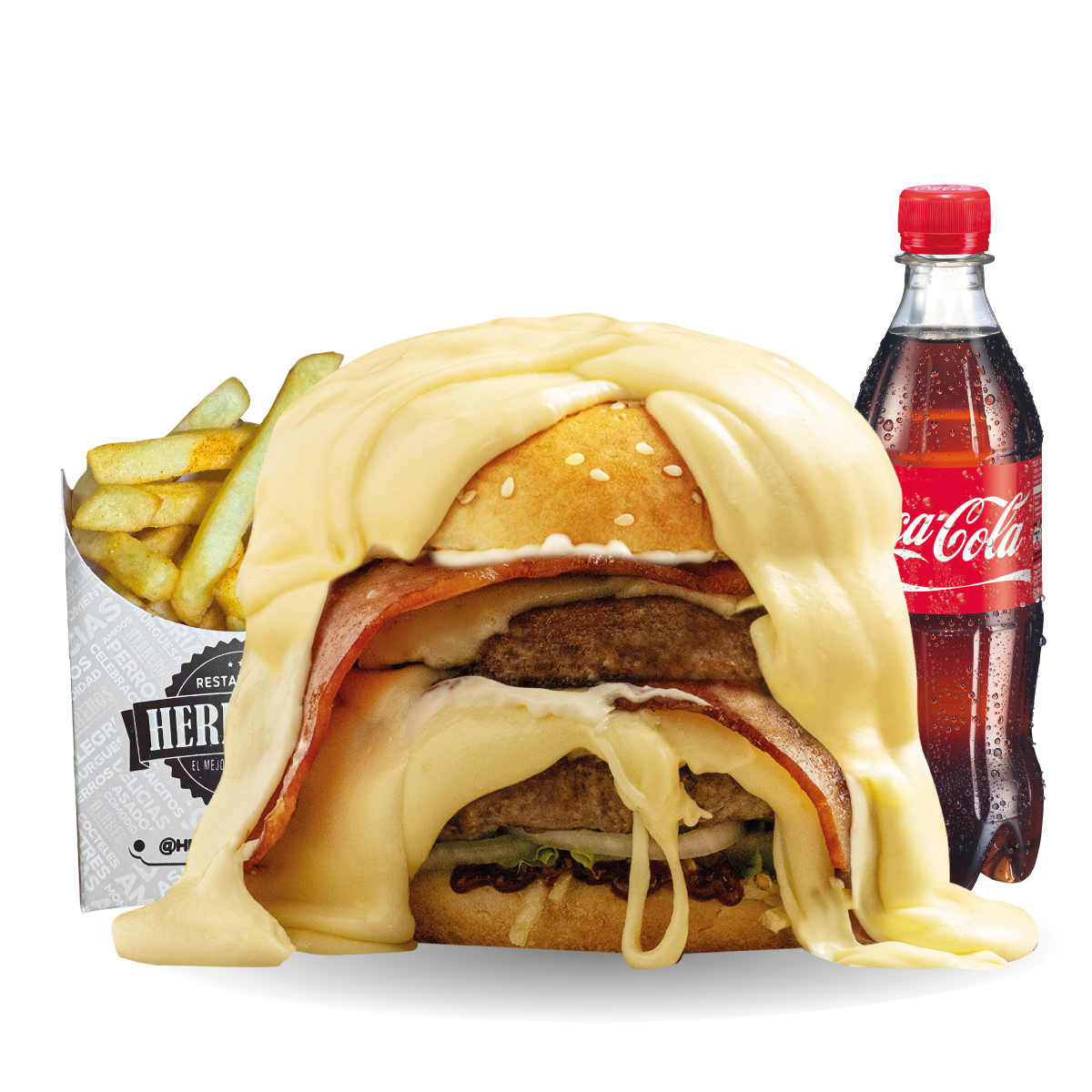 Doble carne 150 g, exclusiva Herreros, queso mozzarella, doble tocineta, salsa de mamá, BBQ, lechuga y cebolla + Papas + Gaseosa