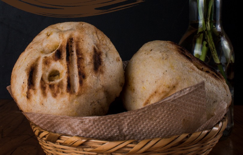 Arepa de la casa rellena de carne, chicharrón y maduro.