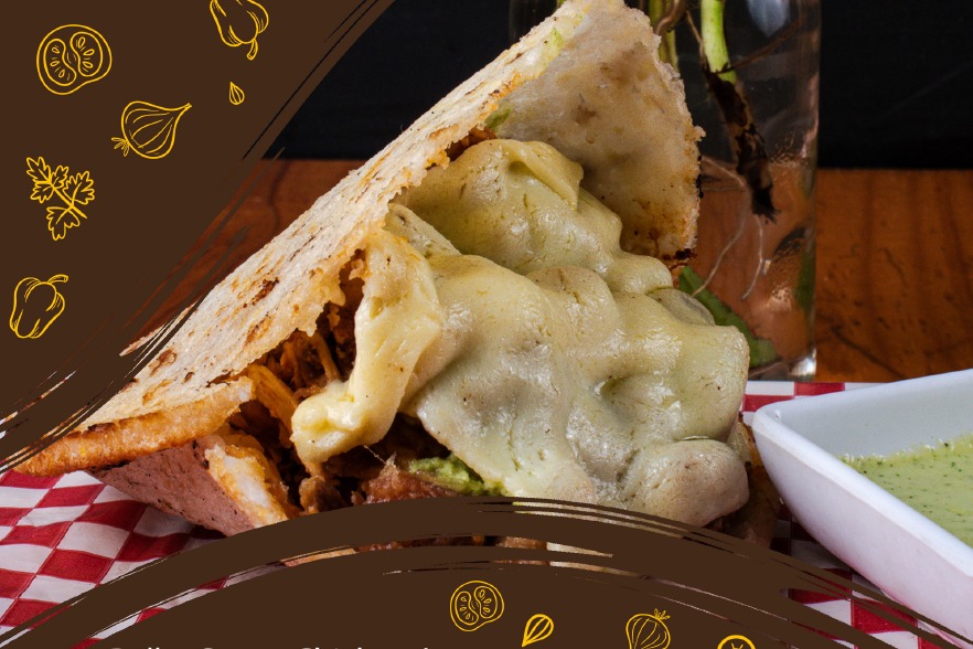 Deliciosa arepa rellena de carne, chicharrón, jamón y queso.
