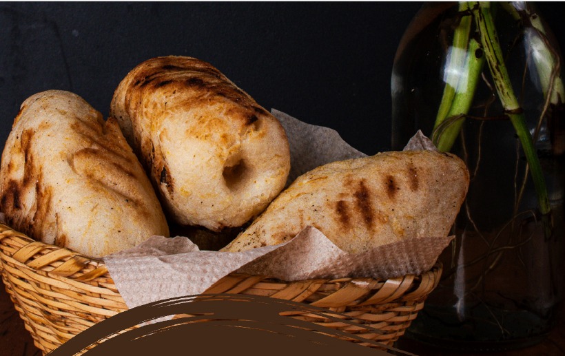Arepa de la casa rellena de costilla, chorizo, maicitos y queso.
