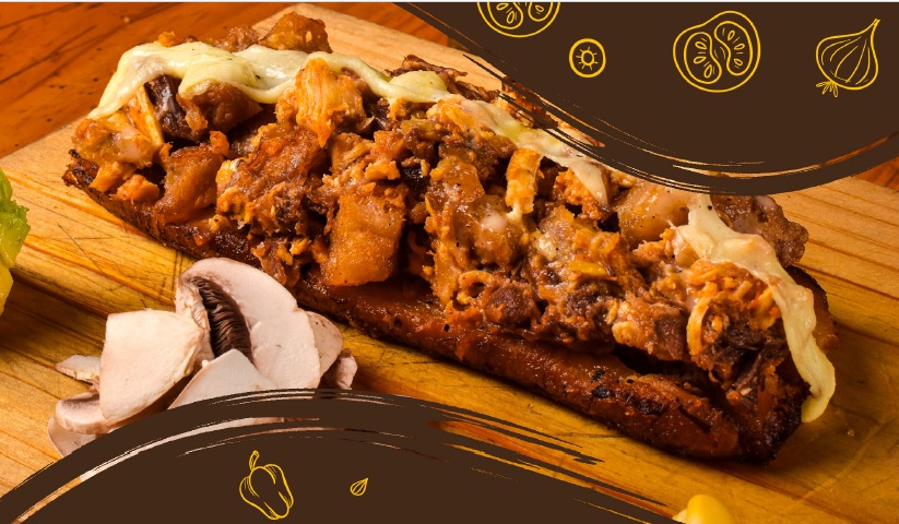 Delicioso Maduro relleno (pollo, carne, chicharrón, chorizo).