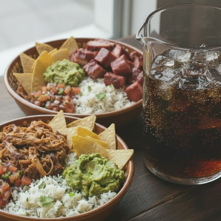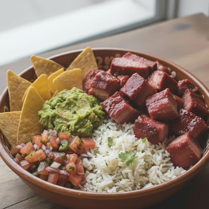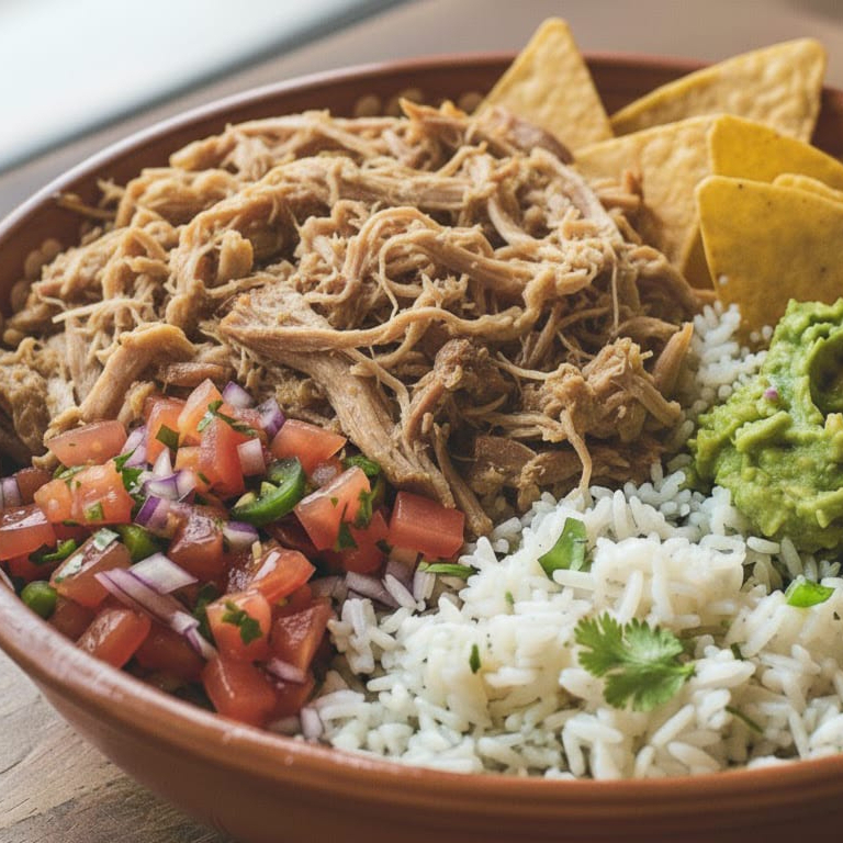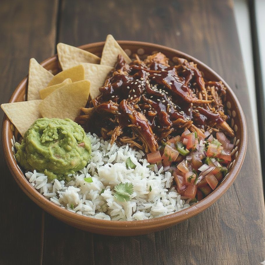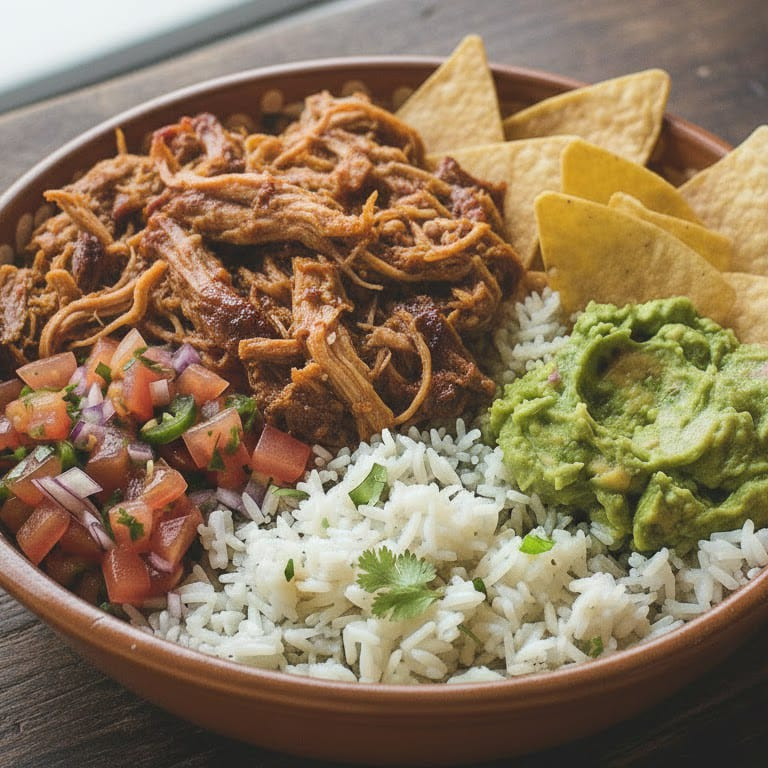 Cerdo desmechado, arroz, pico de gallo, totopos y guacamole.