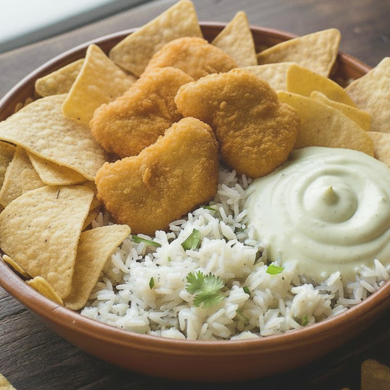 4 pzas De nuggets de pollo, arroz, totopos, salsa de la casa.