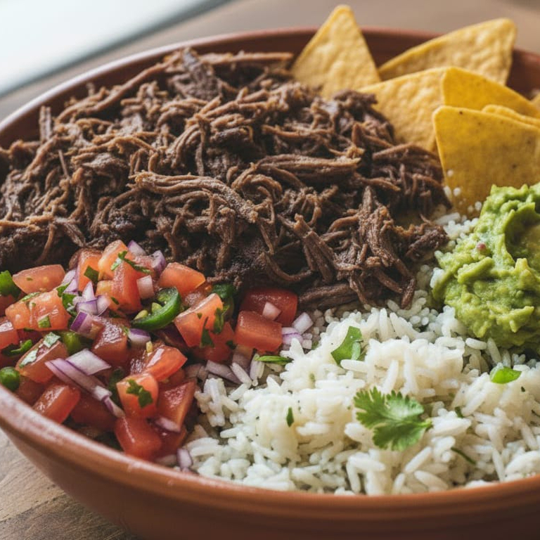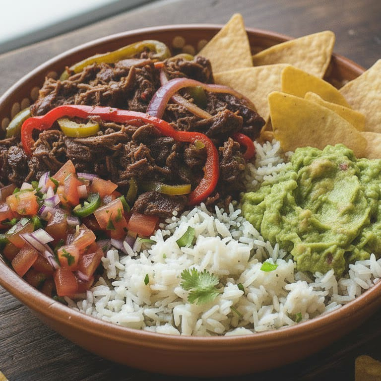 Carne desmechada, arroz, pico de gallo, totopos y guacamole.