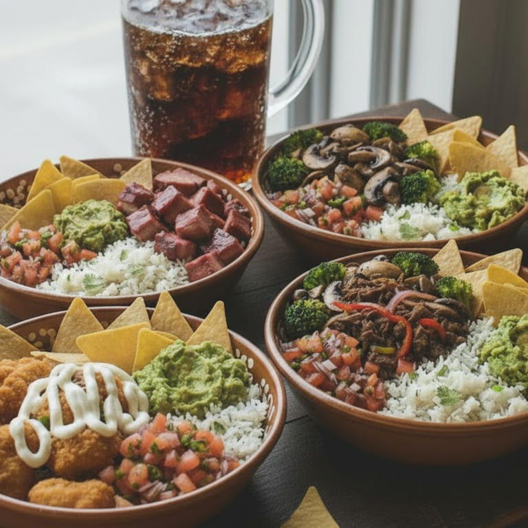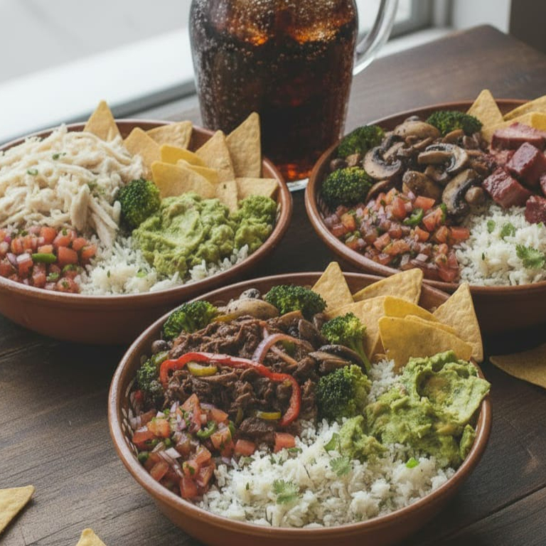 Carne despechada , cebolla , pimentón , arroz , pico de gallo , totopos , guacamole