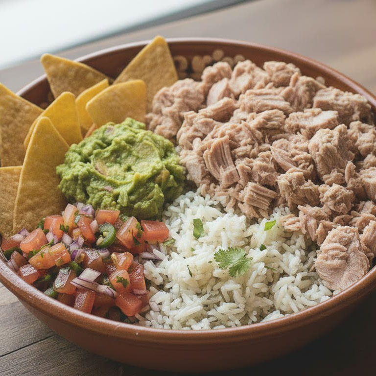Atún, arroz, pico de gallo, ajonjolí tostado, totopos y guacamole.