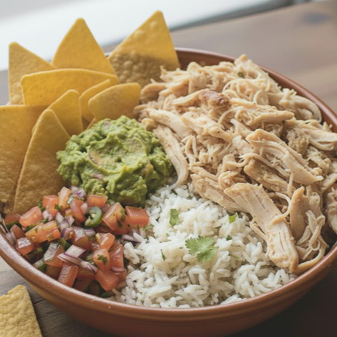 Pollo desmechado, arroz, pico de gallo, totopos y guacamole.