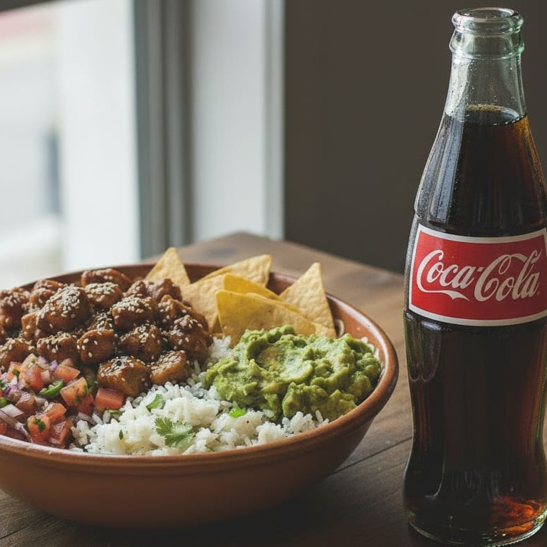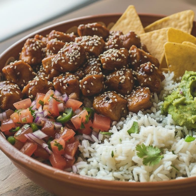 Pollo teriyaki , arroz , totopos , pico de gallo , guacamole