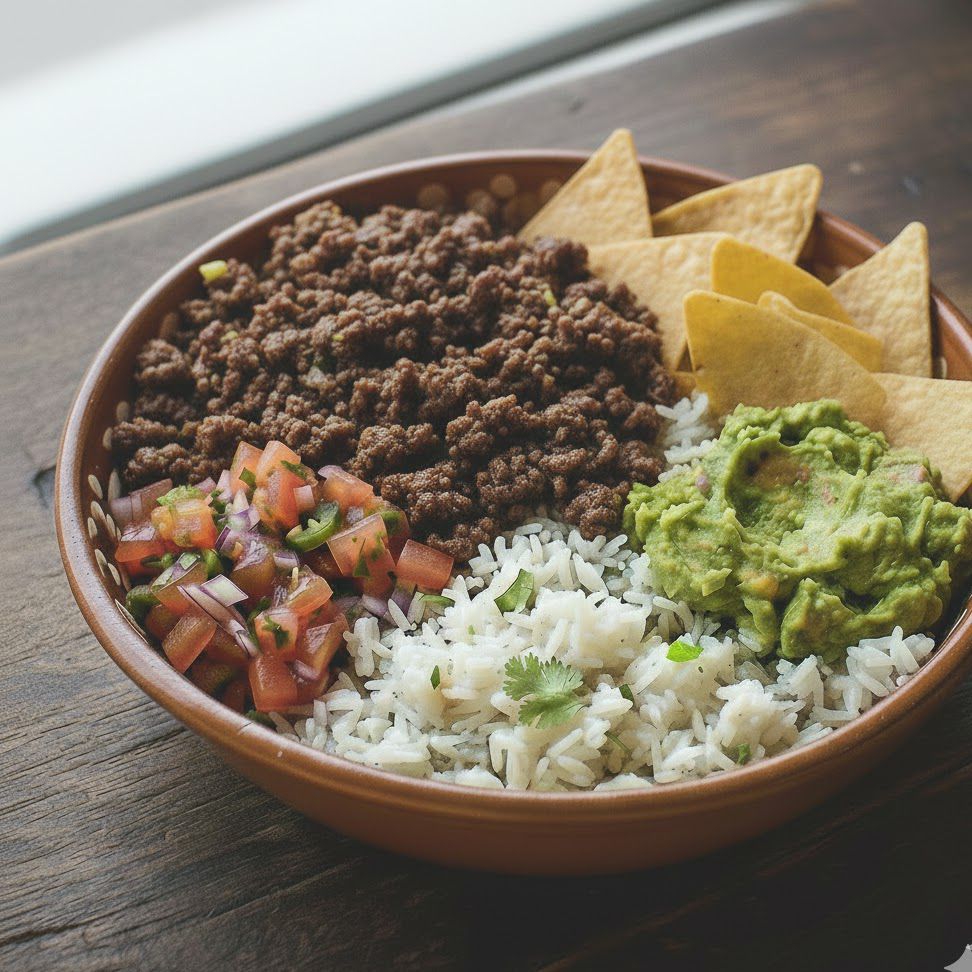 Carne molida , arroz , totopos , pico de gallo , guacamole