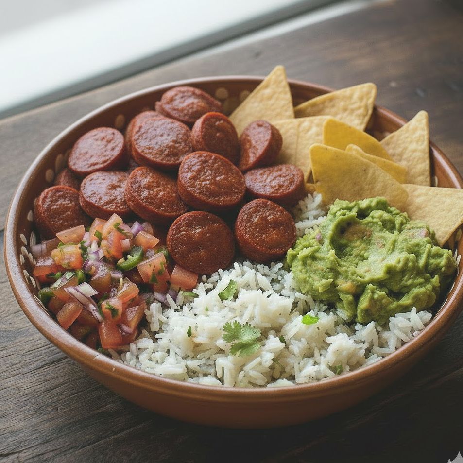 Chorizo santarrosano , arroz , totopos , pico de gallo , guacamole