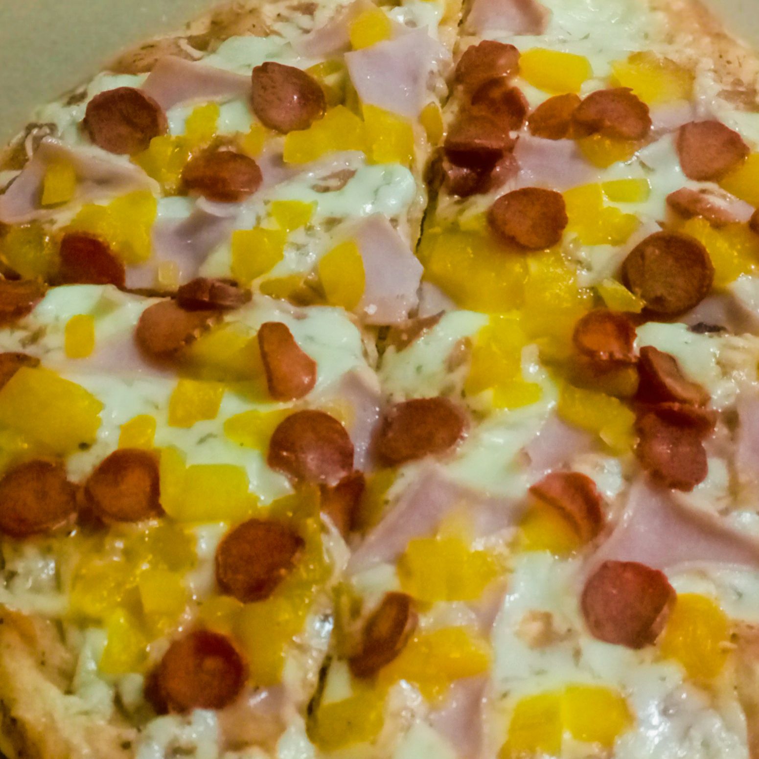 Chorizo, cabano, cebolla, champiñones, piña y queso.