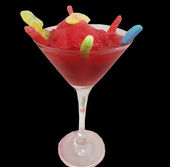 Dulce granizado de limón y granadina acompañado con gomitas.