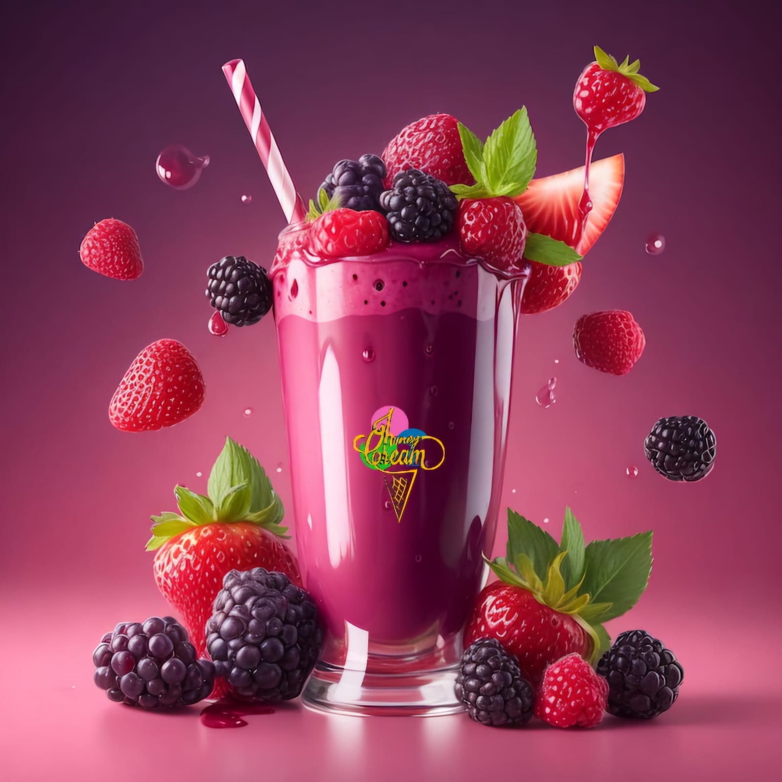 Batido cremoso de pulpa de fresa y mora con helado de frutos del bosque.