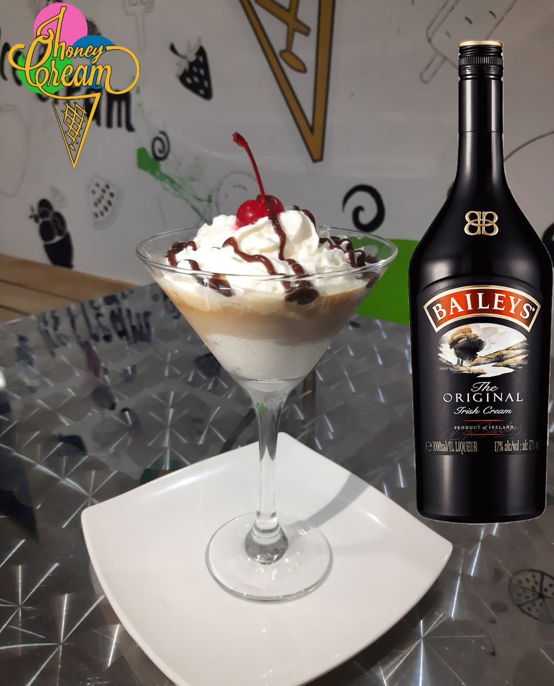 Delicioso helado de vainilla bañado en un espresso doble, Baileys y crema chantilly; decorado con cereza.