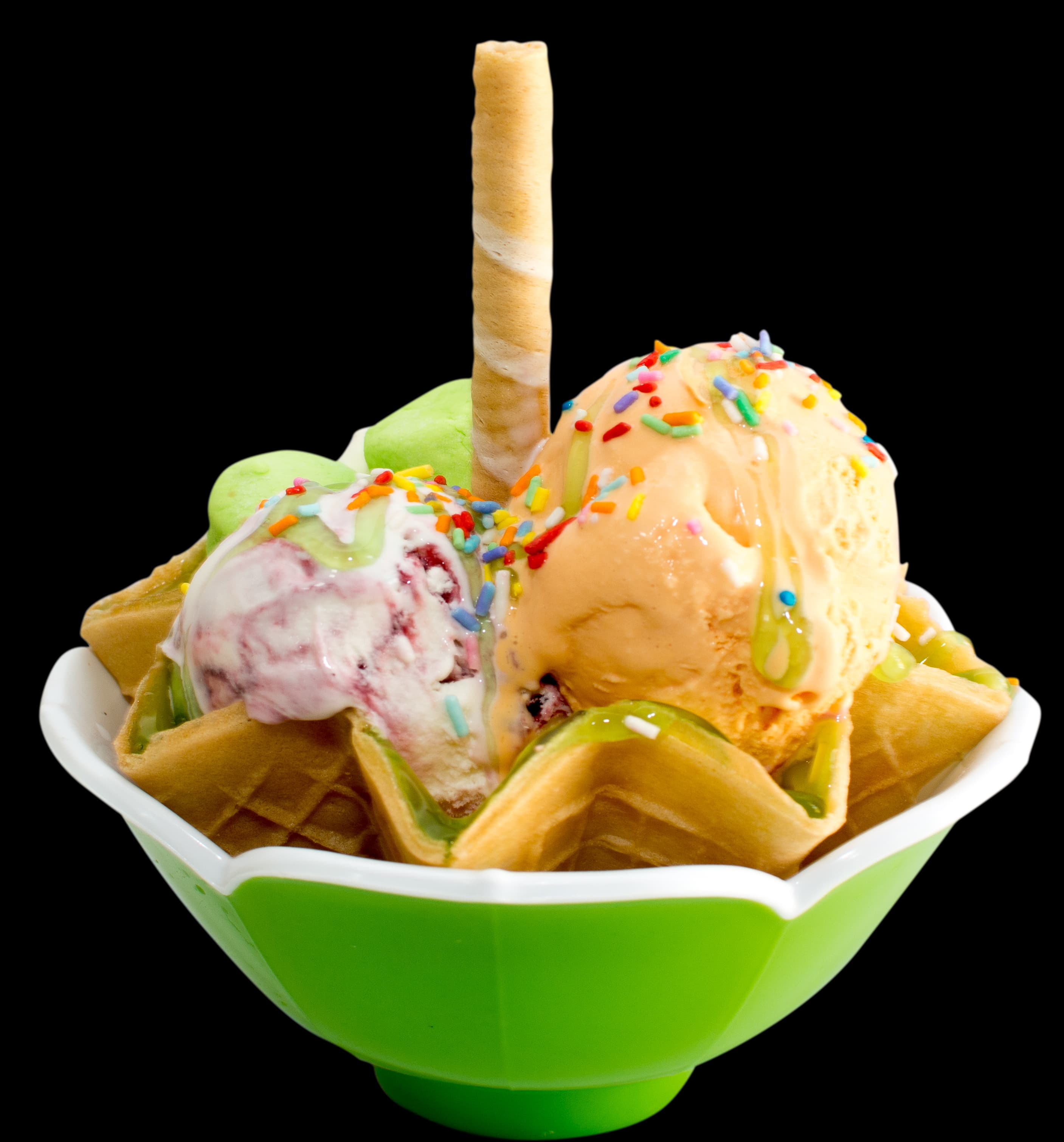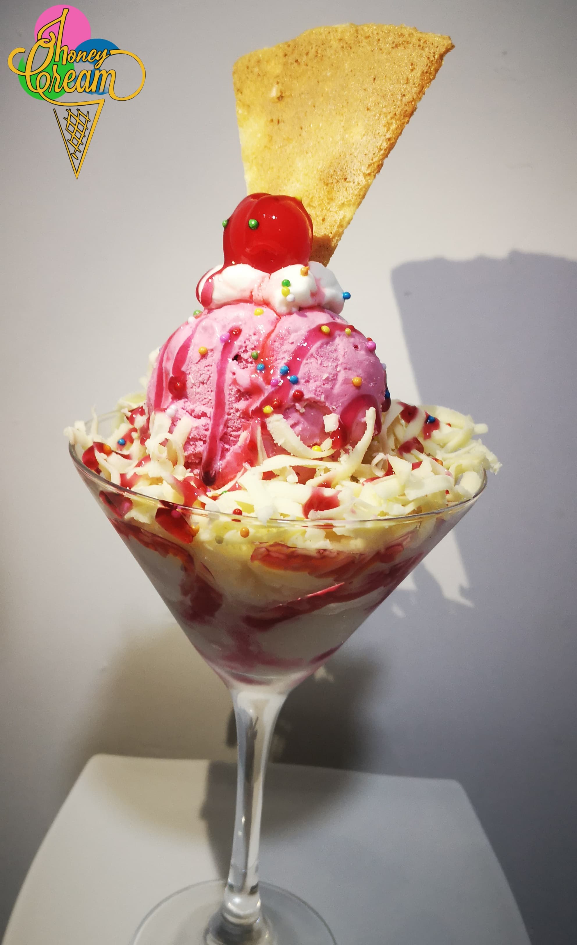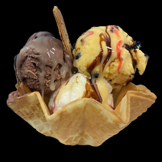 Combinación de dos sabores de helado, acompañado de una copa llena de queso rallado, salsa, crema chantilly, cereza, topping y barquillo.