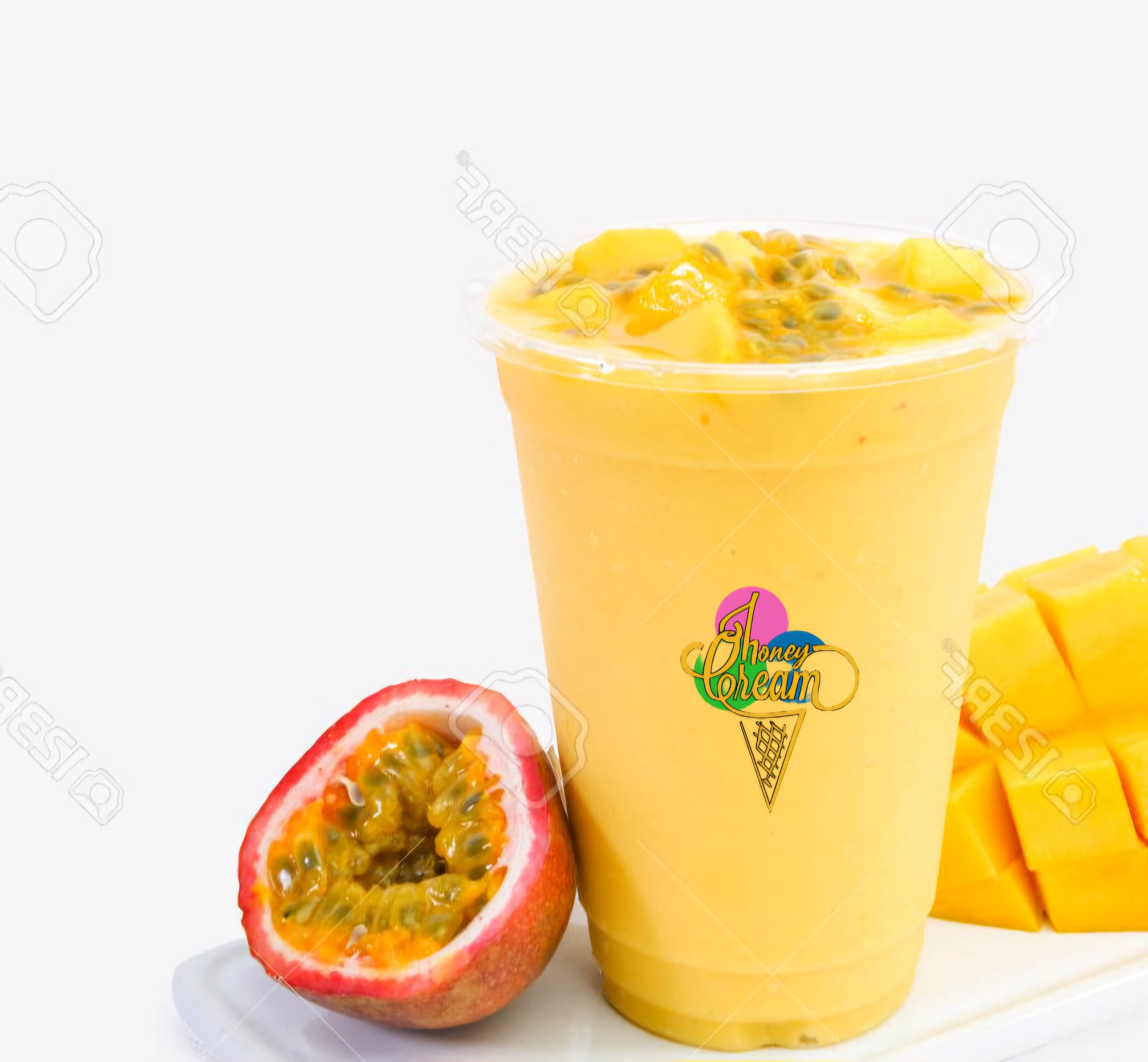 Batido cremoso de pulpa de maracuyá y mango con helado de Vainilla.