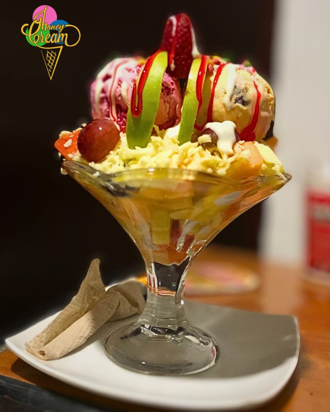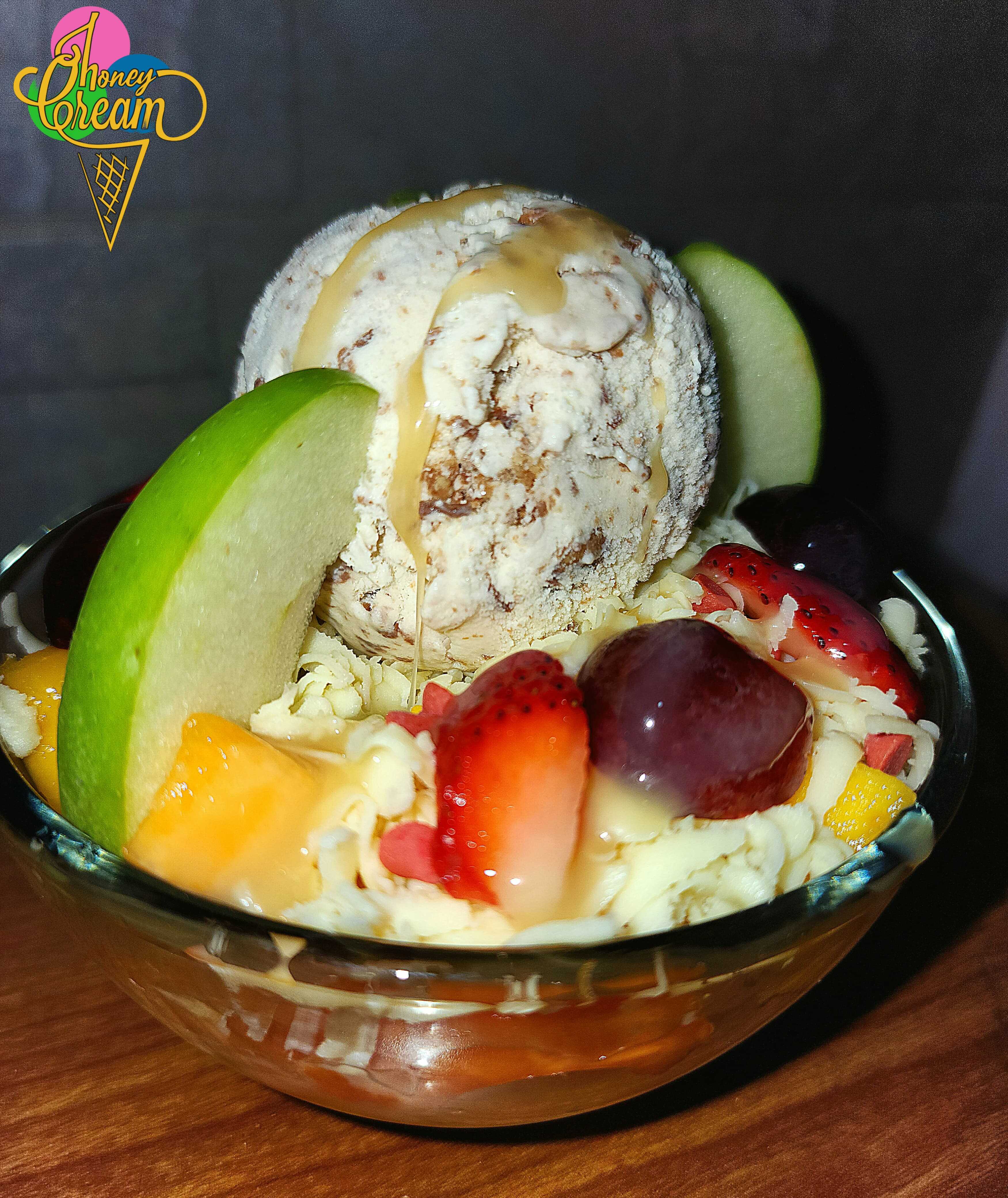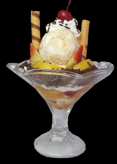 Deliciosa combinación de fruta fresca (papaya, mango, banano, uva, manzana verde y fresas) con tu helado favorito, queso, leche condensada, salsa y chips de colores.