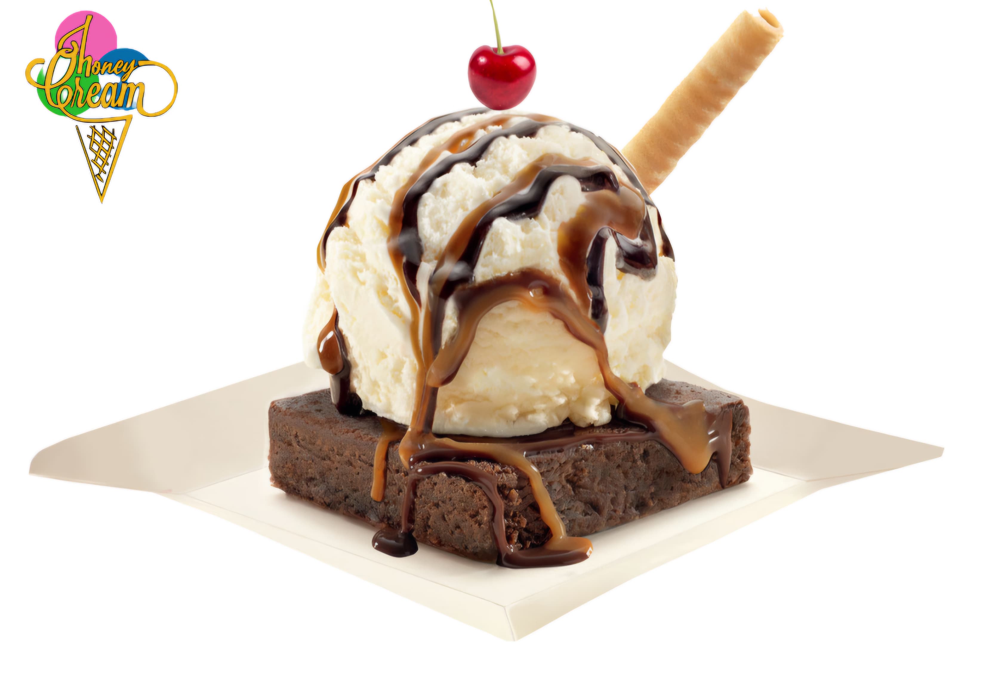 Deliciosa combinación de esponjoso brownie caliente. Un sabor de helado, chantilly, salsa, cereza y barquillo.