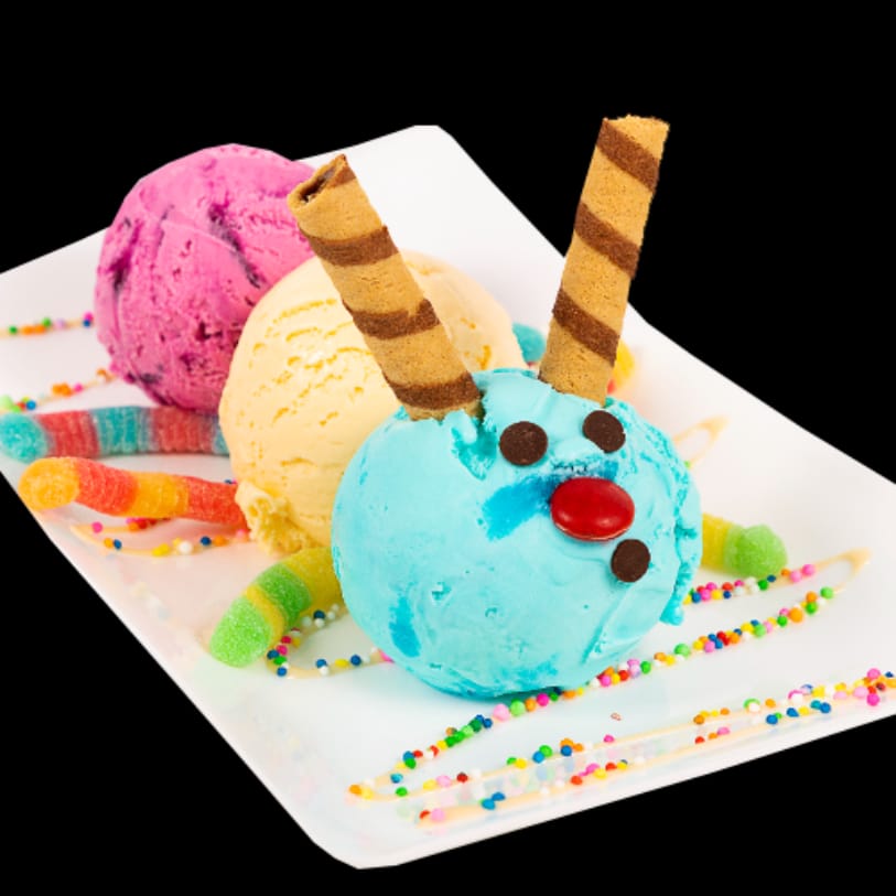 3 Mini bolas de helado y divertidos toppings que dan forma a nuestro gusanito (gomitas, barquillo, M&M, grageas de colores y salsa).