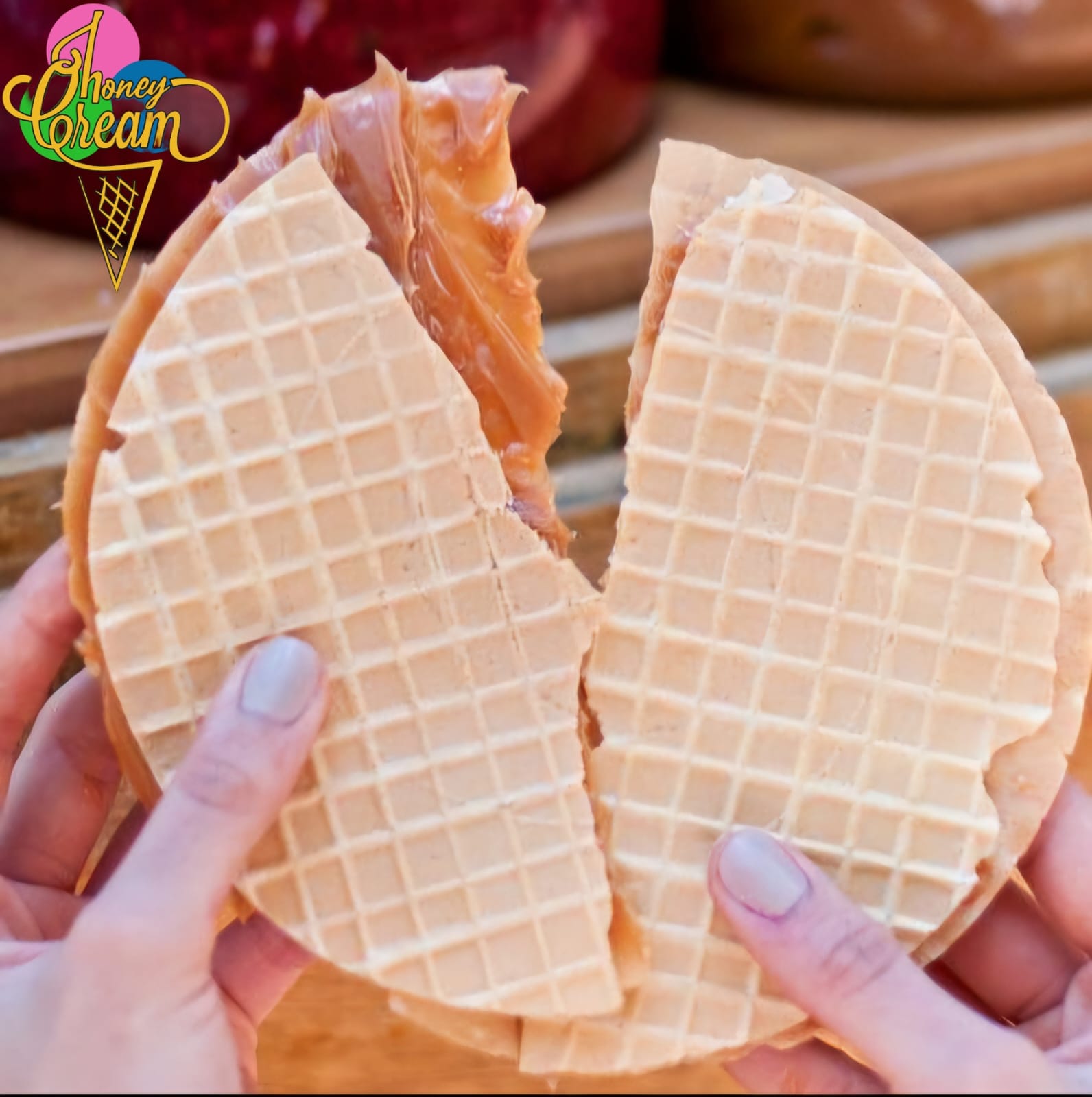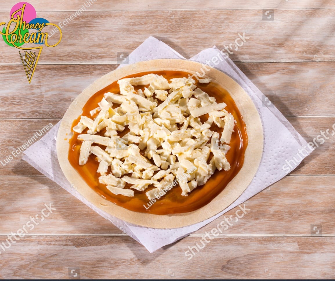 Oblea rellena con queso doble, crema rallada, arequipe, crema de leche, coco y salsa dulce.