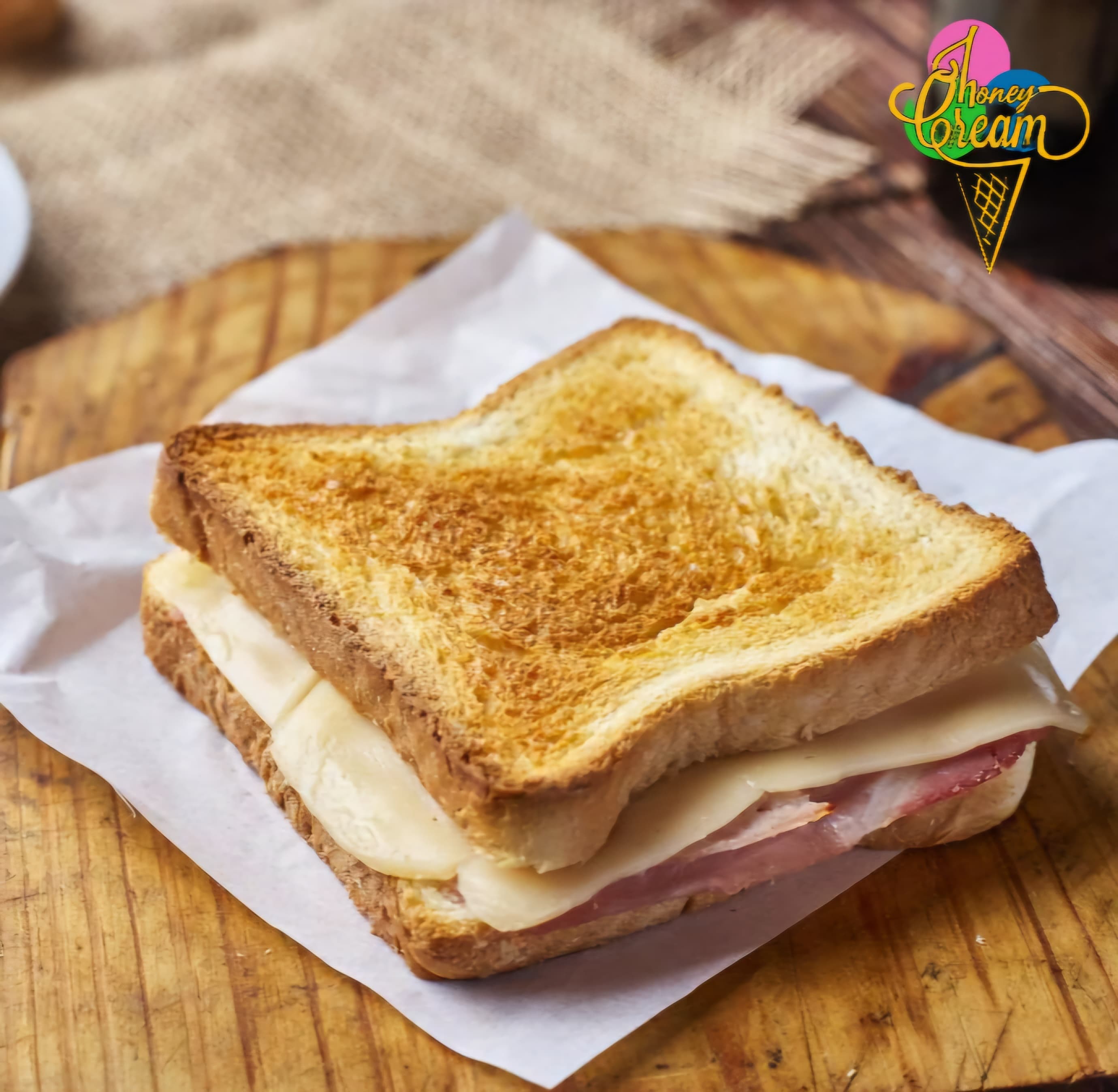 Sándwich caliente típico con jamón, queso y salsa.