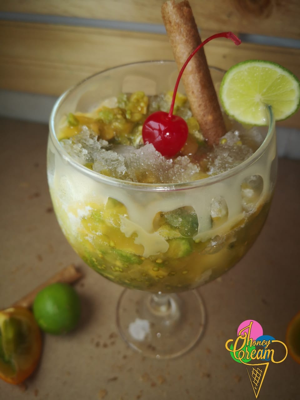 Explosión de sabor cítrico. Dos sabores de helado combinados con lo ácido de la fruta maracuyá y lulo, crema chantilly y leche condensada.