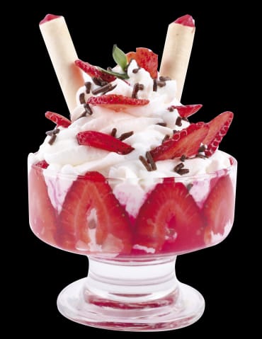 Fresas frescas, bañadas con crema chantilly, un sabor de helado, crema preparada y topping.