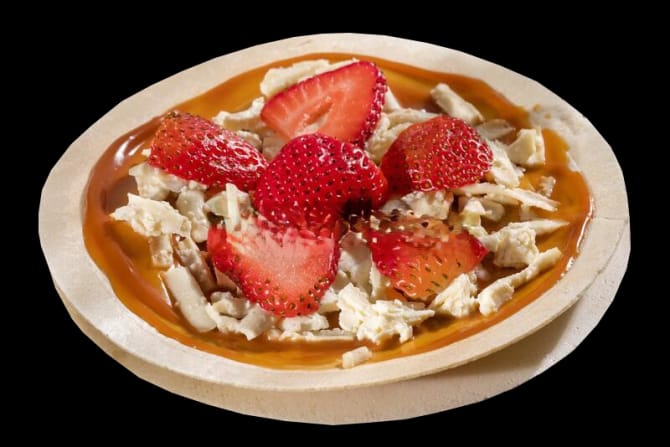 Oblea rellena con salsa de arequipe, fresa, crema de leche y coco rallado.