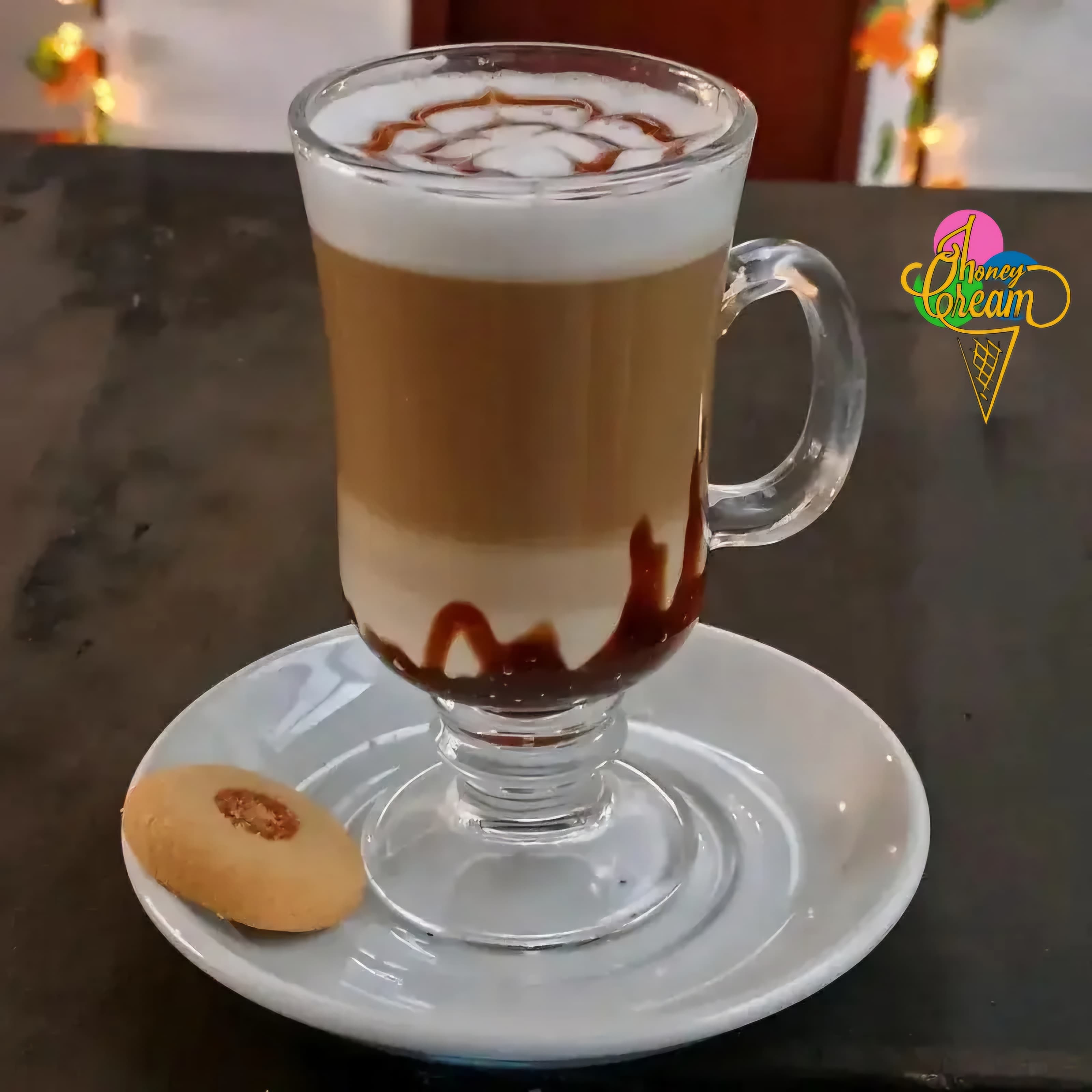 Café espresso caliente, Leche cremosa vaporizada, esencia de vainilla, aderezo chocolate y galleta.