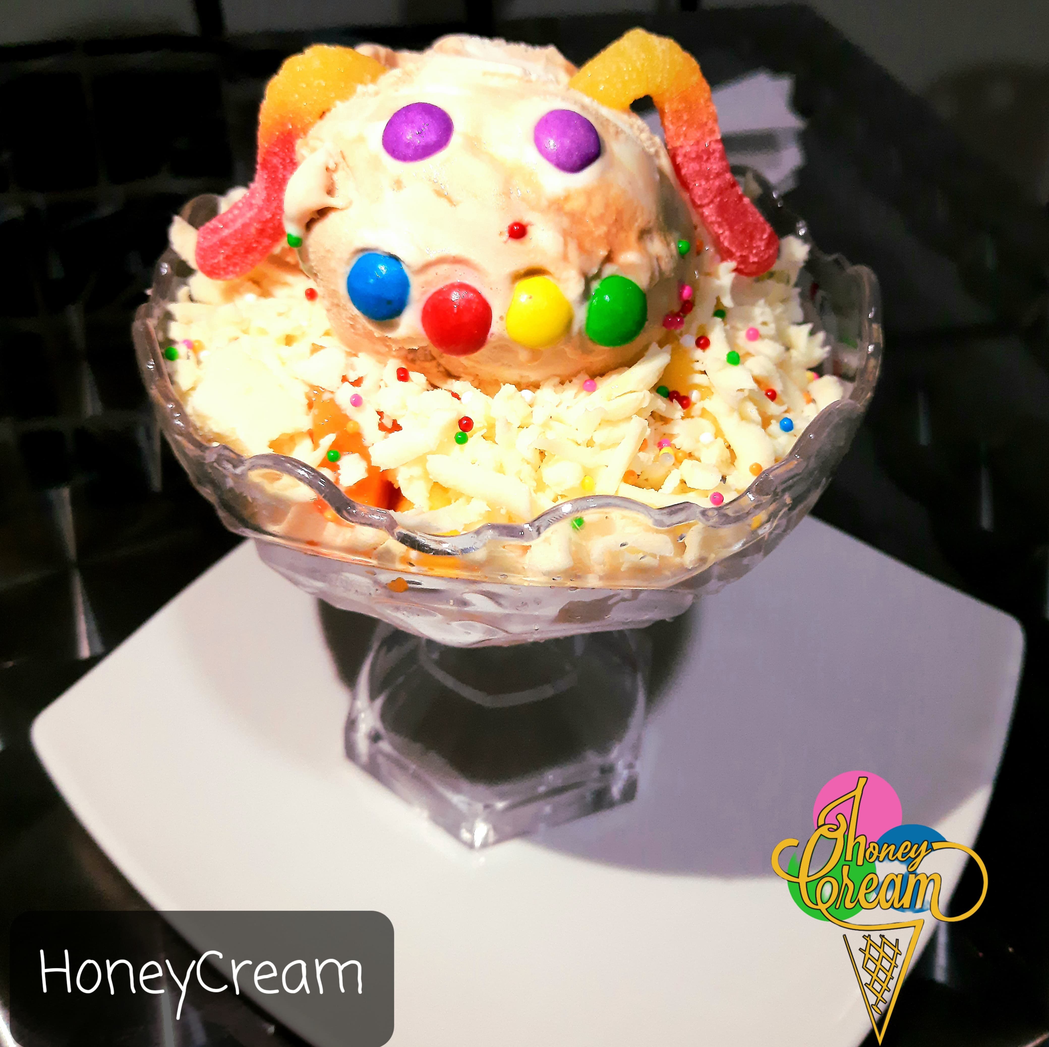 Un sabor de helado especialmente decorado con galletas, barquillo, M y M, salsas con grageas de colores.