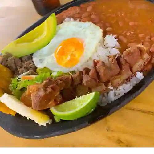 Bandeja paisa con frijoles, chicharrón carnudo de 150 g, carne molida, chorizo, huevo, aguacate, patacón, arepa y ensalada.